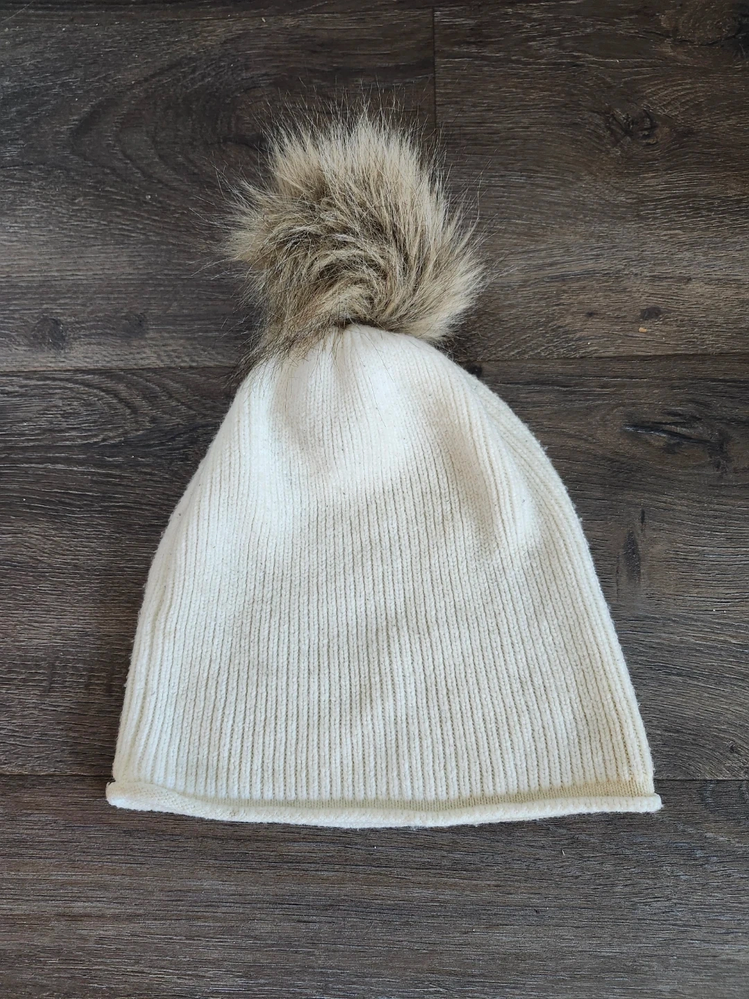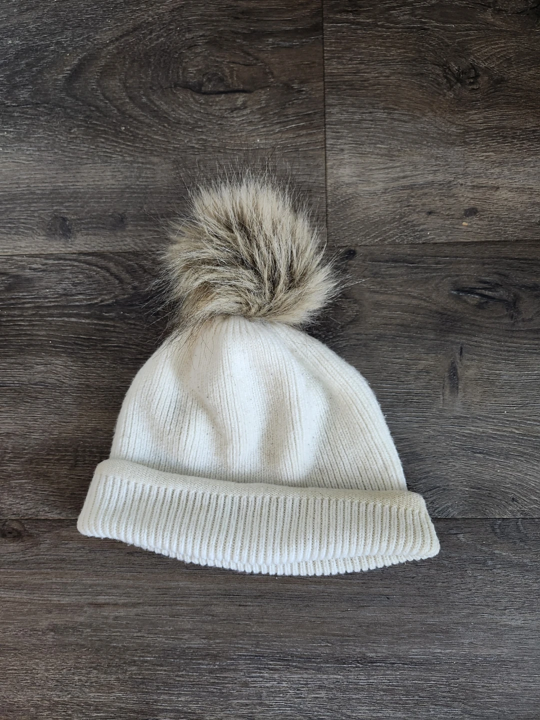 Cozy knit beanie in a cream colour! It has a cute faux fur pom pom on top. Perfect for keeping warm during the colder months. Can be worn in 2 ways.