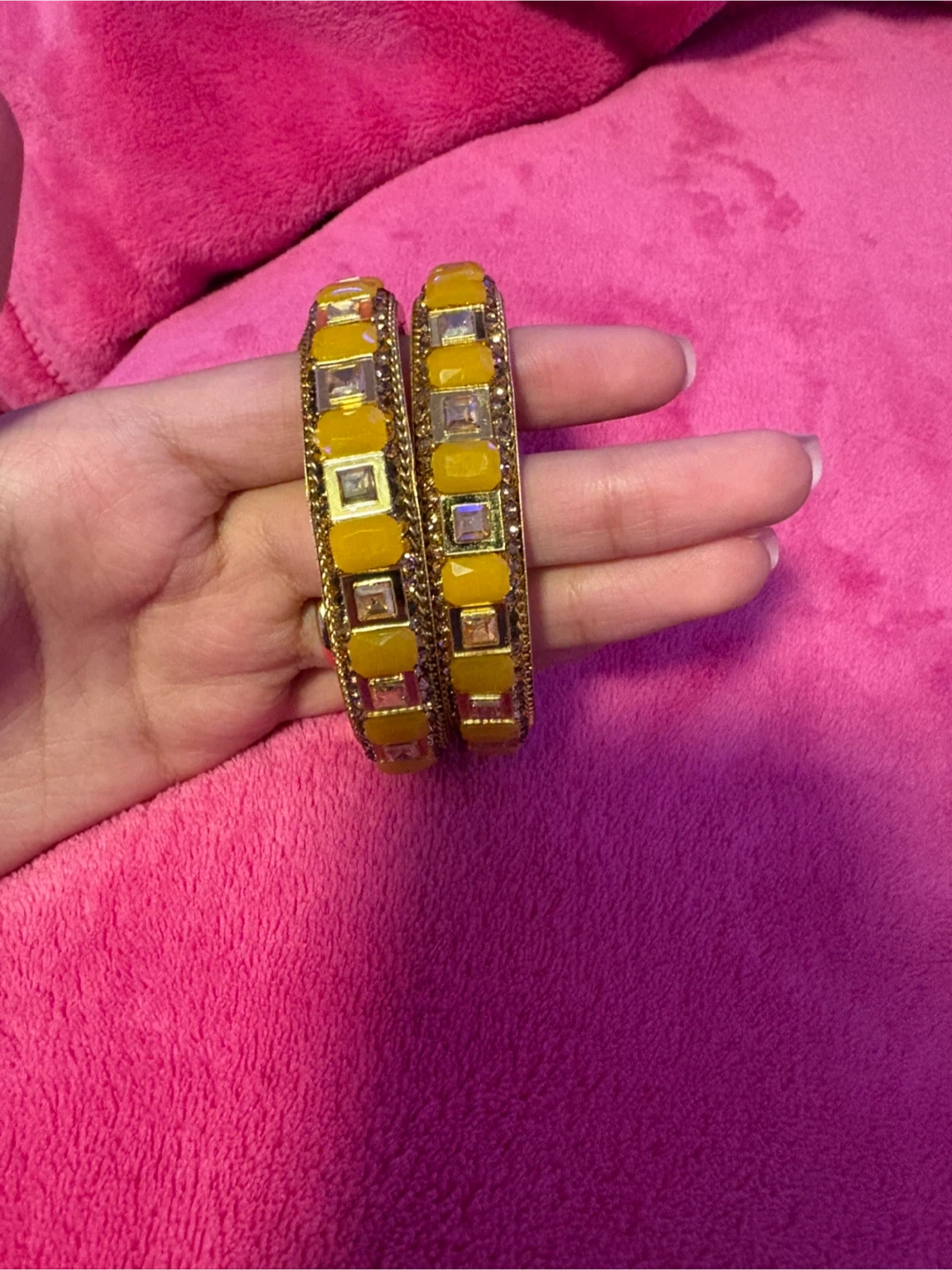 Selling a beautiful set of yellow and gold bangles! They feature a lovely design with square and rectangular stones. Perfect for adding a touch of elegance to any outfit