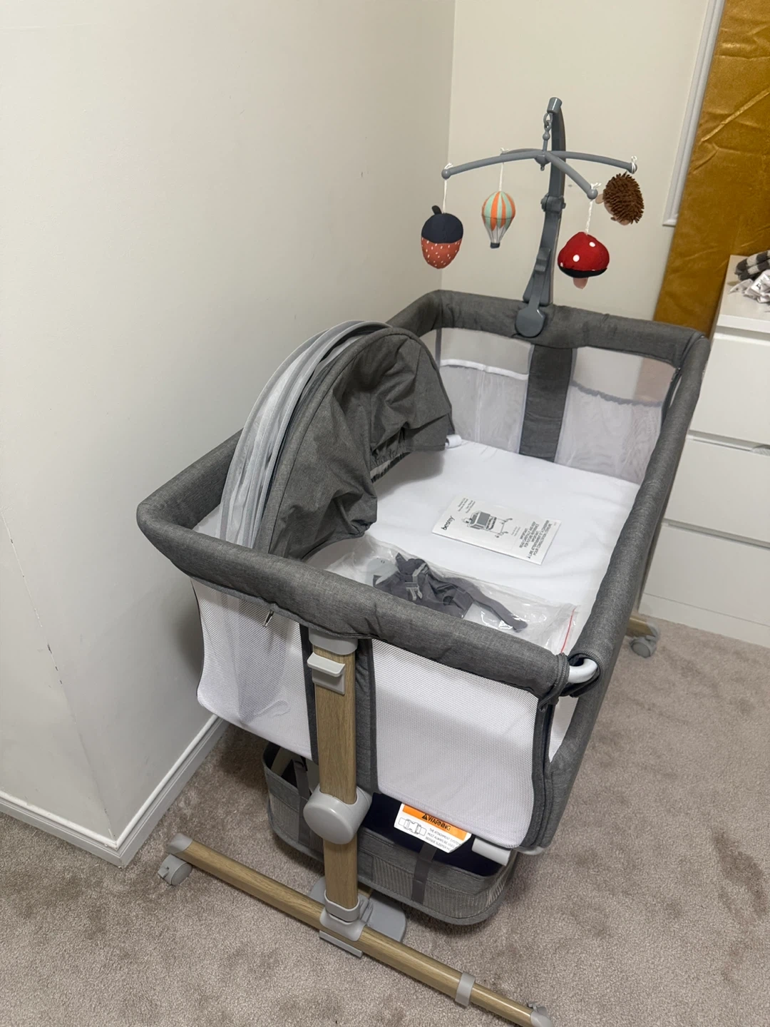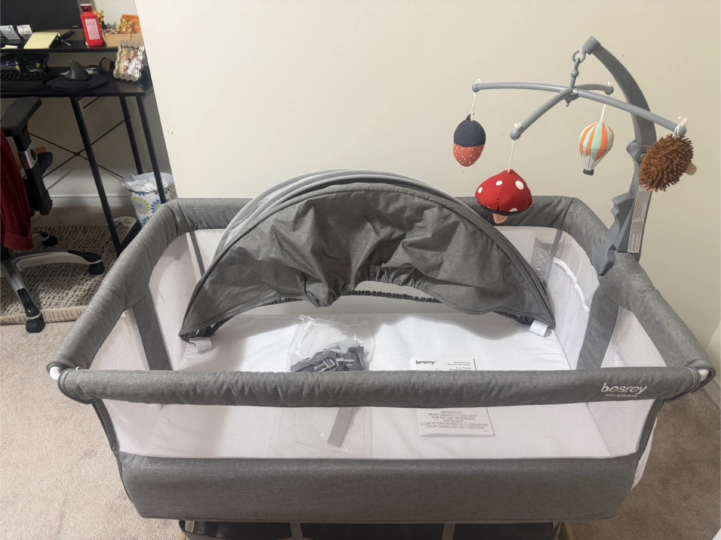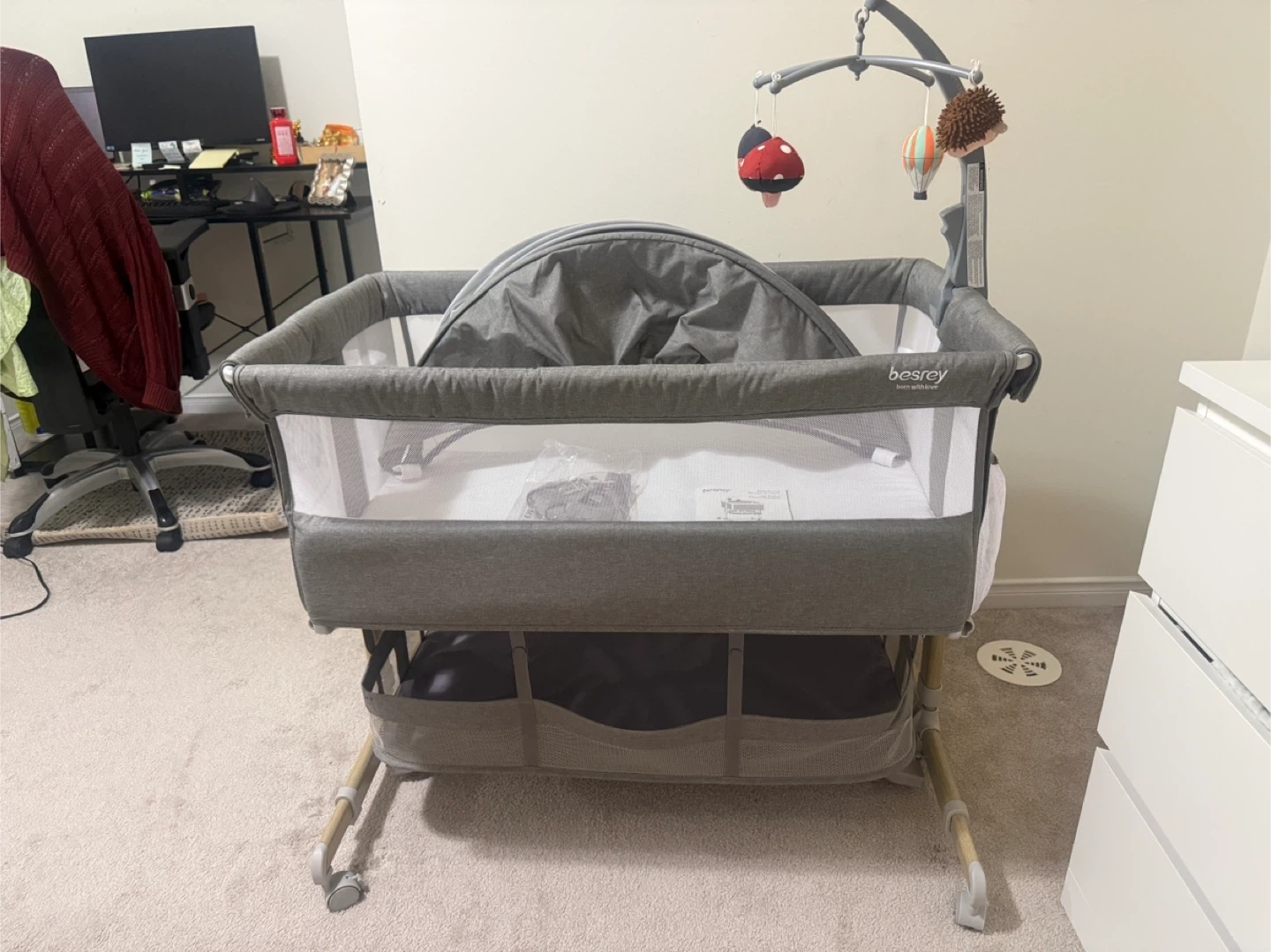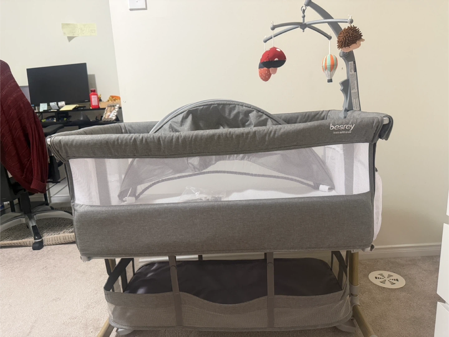 Selling a Besrey baby bassinet that's in excellent condition! It's a safe and cozy sleeping space for your little one. Comes with a mobile to keep baby entertained. Perfect for newborns! Never been used.