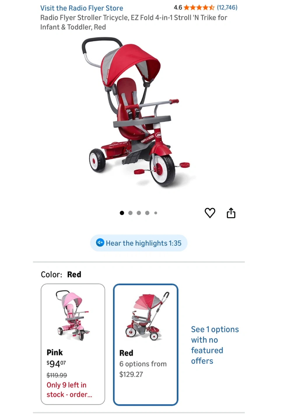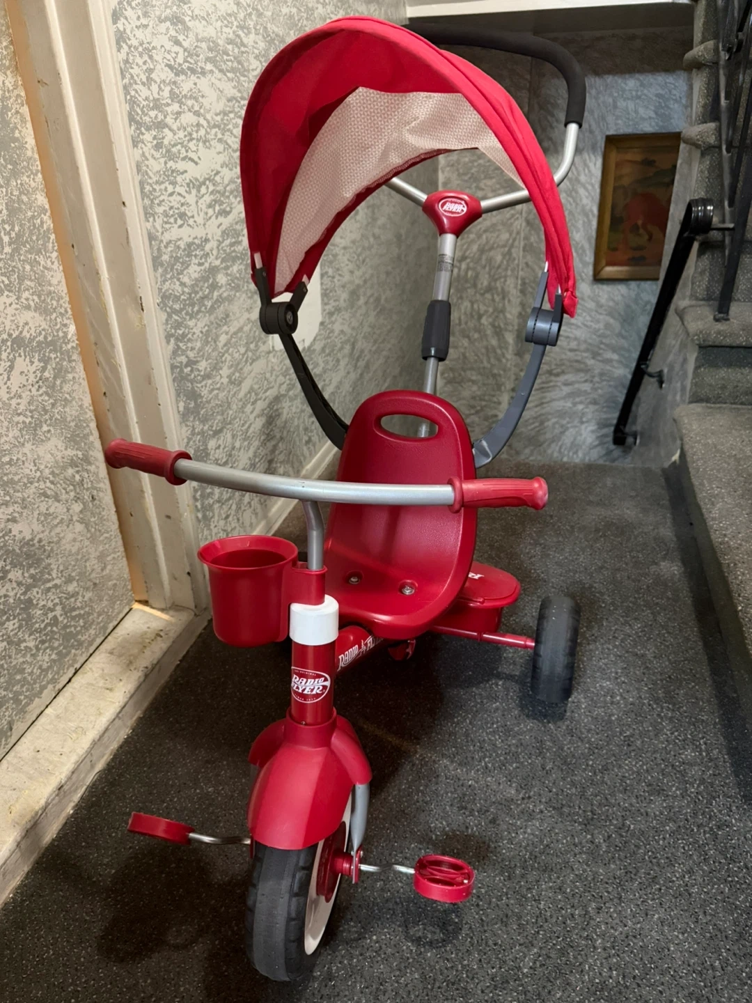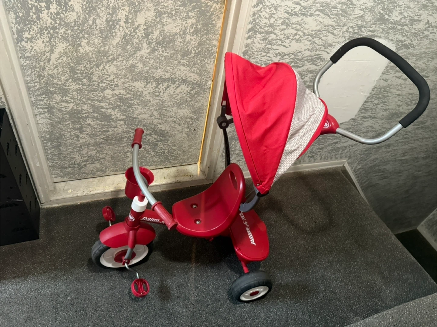 Radio Flyer 4-in-1 Stroll 'N Trike in red! It features an adjustable seat and steel frame. Recommended for ages 1-5.