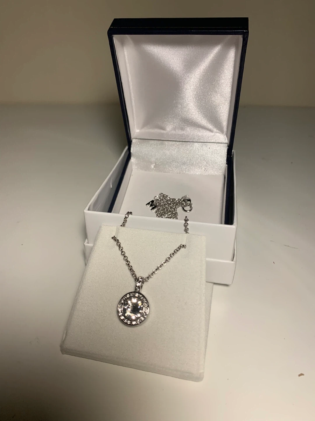 Selling a lovely silver necklace with a round, sparkling Swarovski Crystal pendant. It comes in its original box, making it perfect for gifting or keeping it safe. The chain is silver and has a heart-shaped clasp detail.