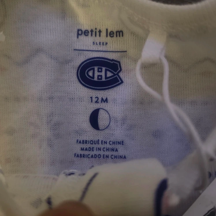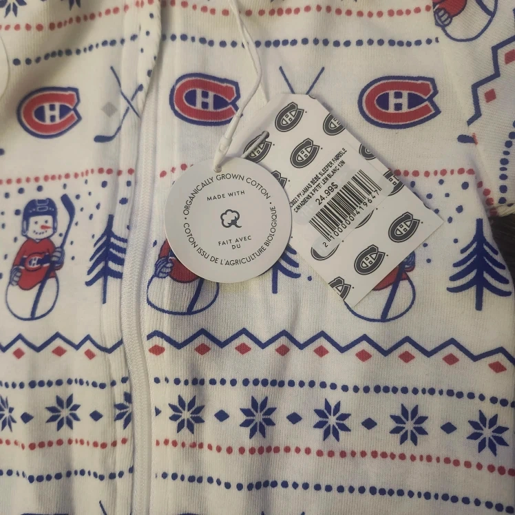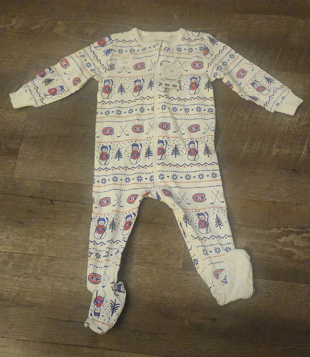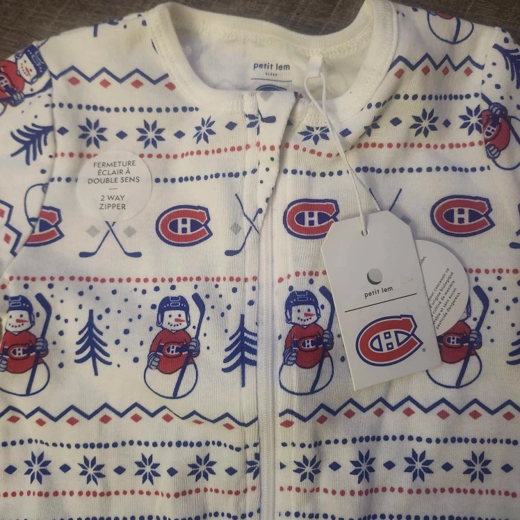Petit Lem sleeper featuring the Montreal Canadiens logo and a cute wintery design! It's size 12M and made with organically grown cotton. Has a 2-way zipper for easy changes and non-slip grips on the feet. Originally bought for $24.99