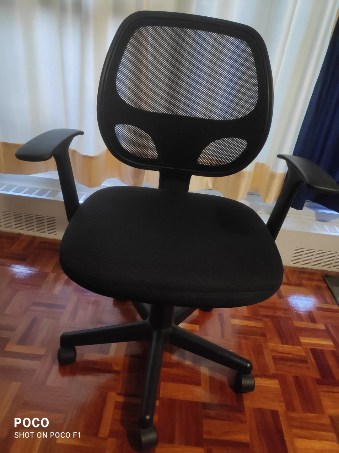 Selling a Flash Furniture mid-back black mesh swivel ergonomic task office chair with arms. It's in great condition and ready for a new workspace! Originally bought for $253.99.