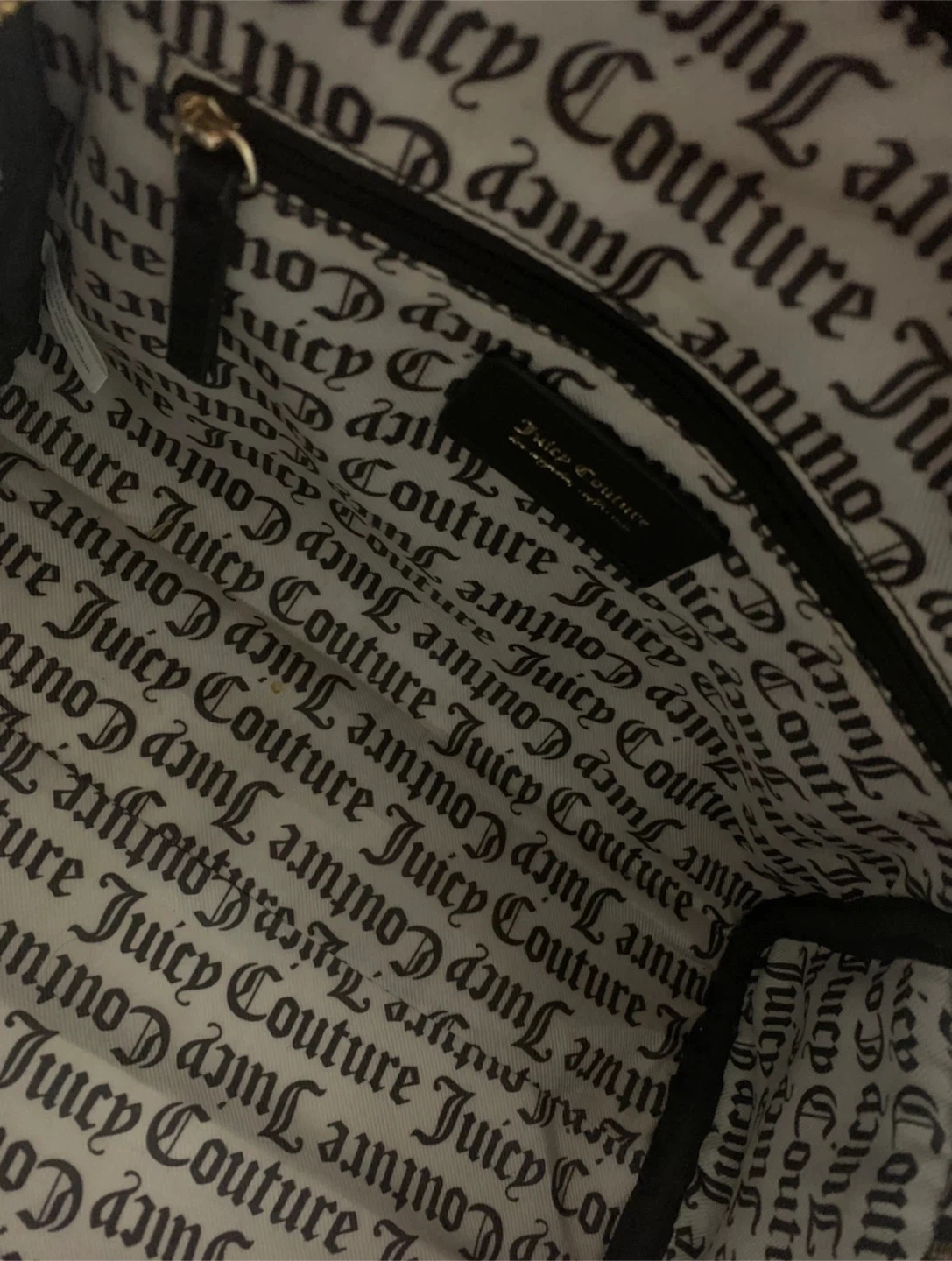 Selling a cute Juicy Couture satchel! It's black with an embossed Juicy Couture pattern all over. The interior lining also features the Juicy Couture logo. It has both handles and a shoulder strap for easy carrying.
