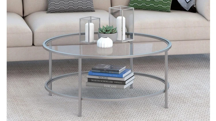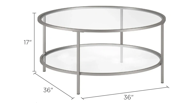 Selling a round glass coffee table! It has a sleek design with a glass top and a lower glass shelf for storage or display. The table is 36 inches in diameter and 17 inches tall. Perfect for adding a modern touch to your living room.