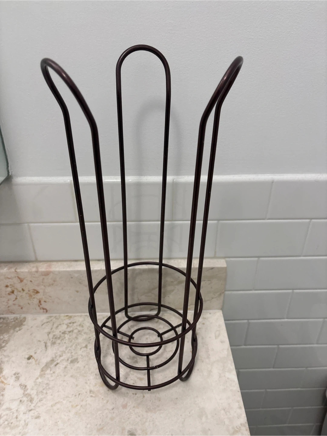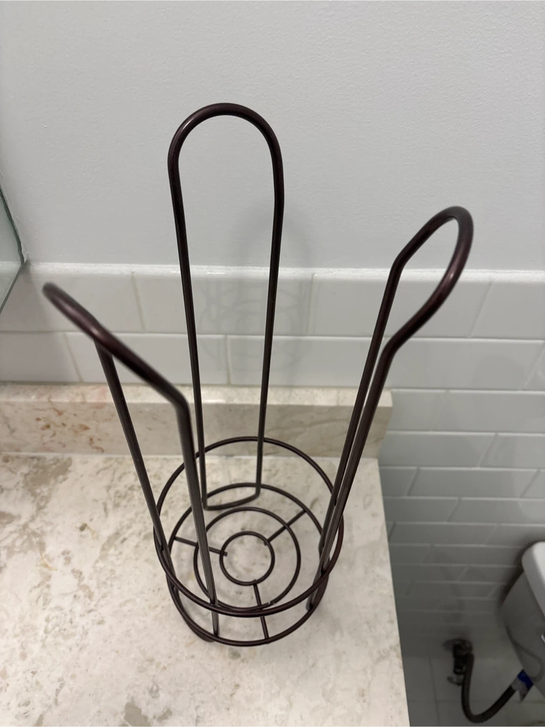 This is a toilet paper holder with a bronze finish. It's in good condition and ready to use in your bathroom. It has a simple, minimalist design that will fit in with most decor styles. Perfect for keeping your toilet paper organized and accessible