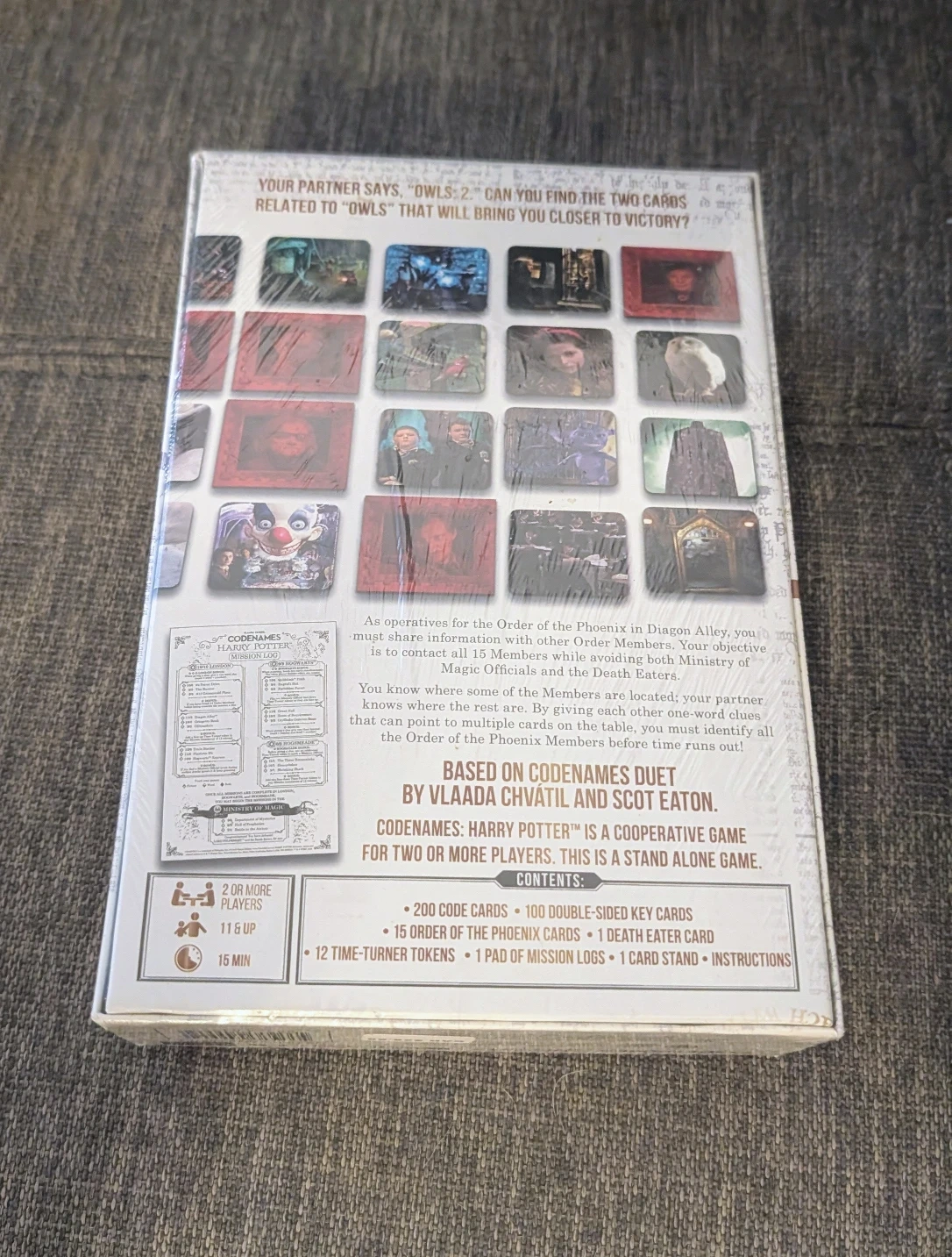 Selling a brand new, still-sealed copy of Codenames: Harry Potter Edition! This is a cooperative game for two or more players. It includes 200 code cards, 100 double-sided key cards, 15 Order of the Phoenix cards, 1 death eater card, 12 time-turner tokens, 1 pad of mission logs, 1 card stand, and instructions. Recommended for ages 11 and up, with a playtime of about 15 minutes!
