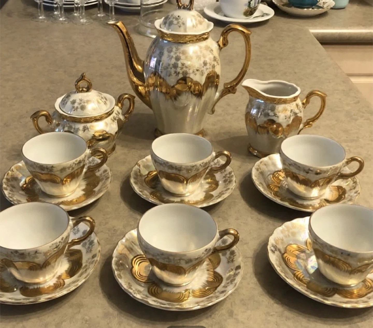 PHOTO 3 — Set of 6 espresso-size cups and saucers with coffee pot