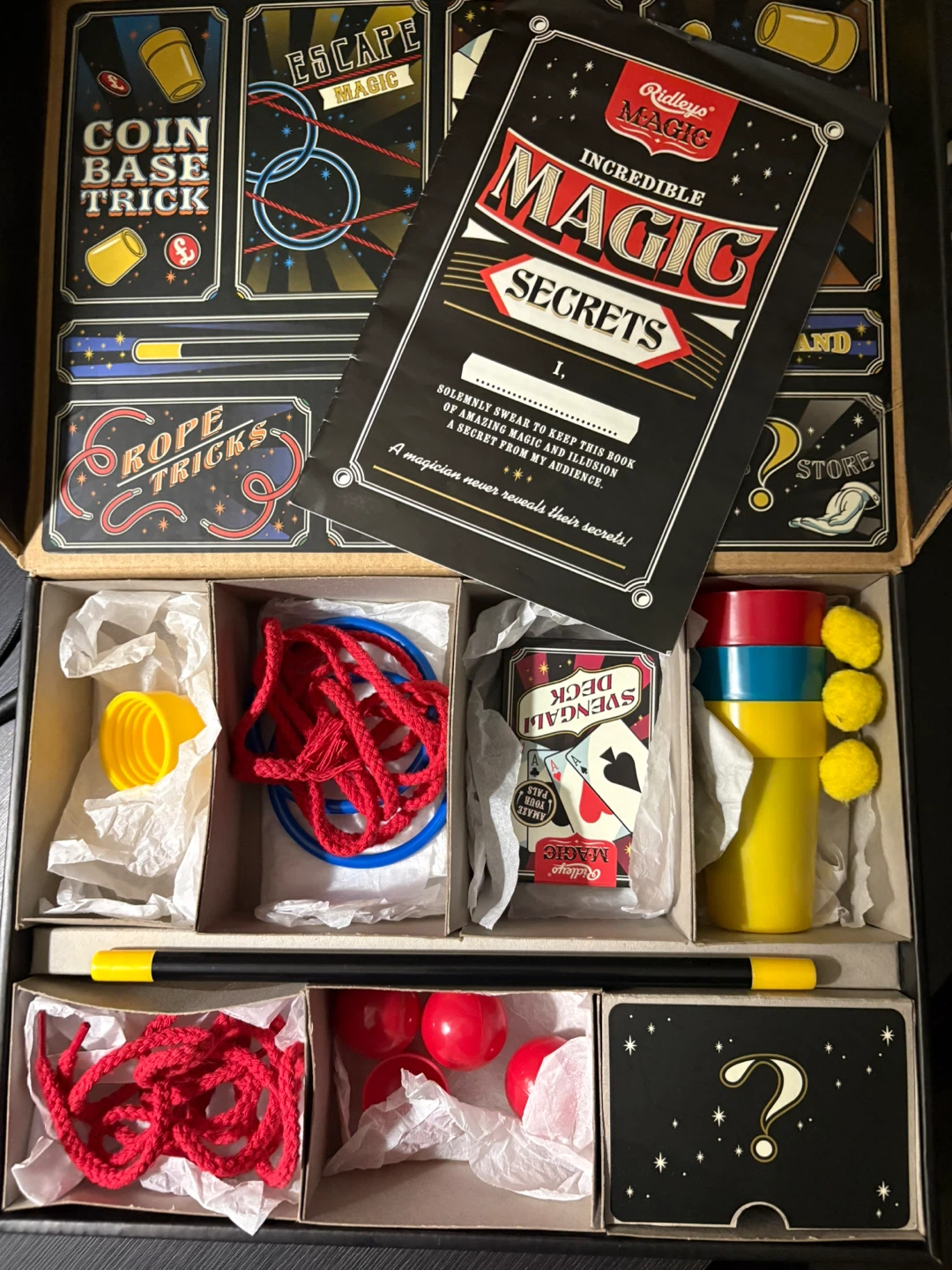 Selling a Ridley's Magic Set, which includes everything you need to learn incredible magic secrets! The set contains Multiplying Balls, Svengali Deck, Cups & Balls, Coin Base Trick, Rings, Rope & Ball, and more magic inside. It also includes a book of magic secrets to help you master your illusions