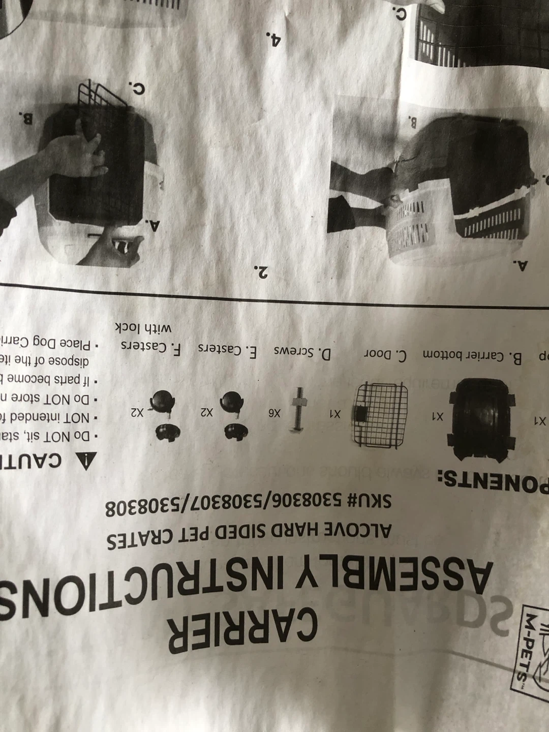 Selling a M-PETS Alcove hard sided pet carrier crate. It has a door with a lock and also has casters. Comes with assembly instructions. All sales are final.