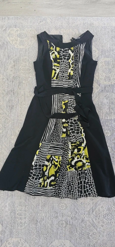 Cute black dress with a fun animal print design! It has a tie around the waist. Perfect for a night out or a special occasion!