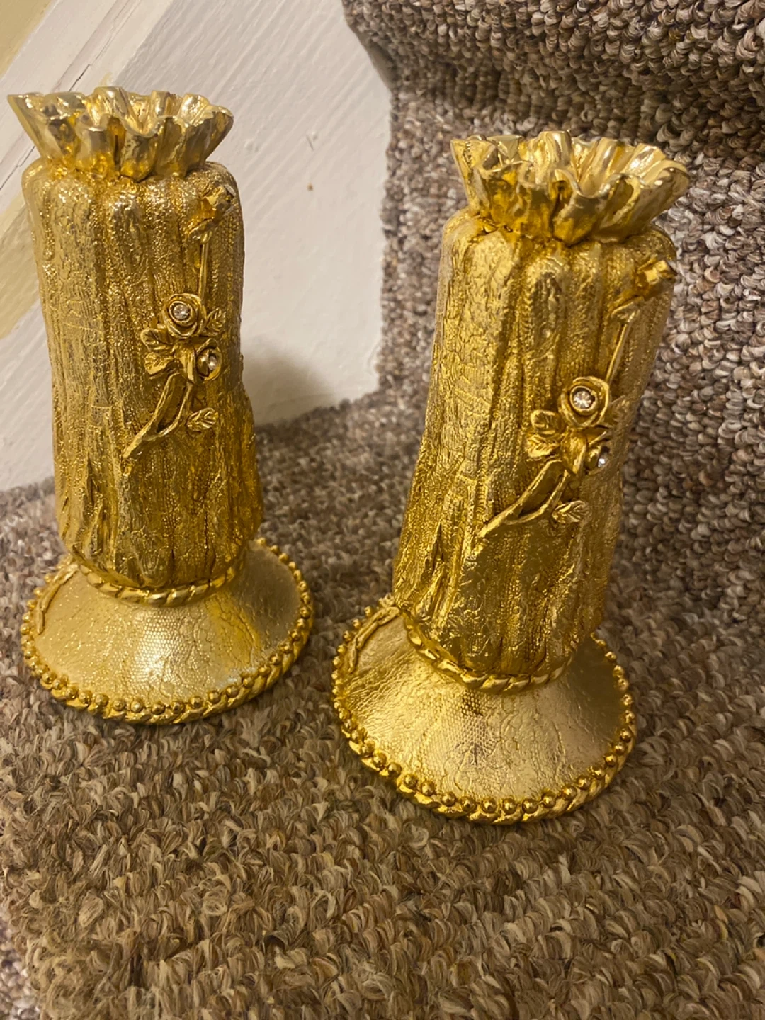 Selling a gold decorative vase. It has a unique design with a rose detail and a textured finish. Perfect for adding a touch of elegance to any room
