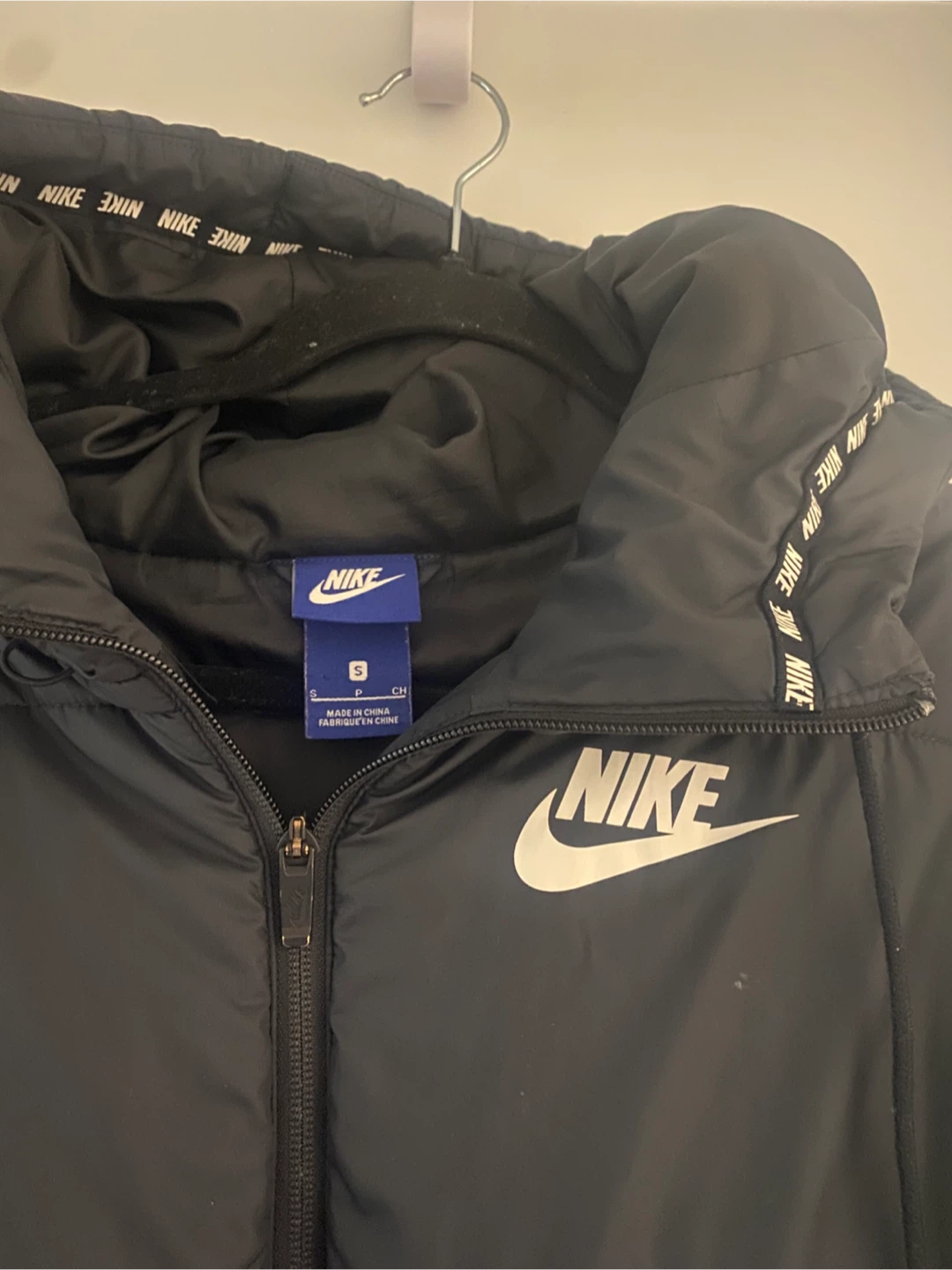 Selling a Nike puffer jacket in size small. It's black with Nike logos on the hood and bottom. Perfect for staying warm this winter!