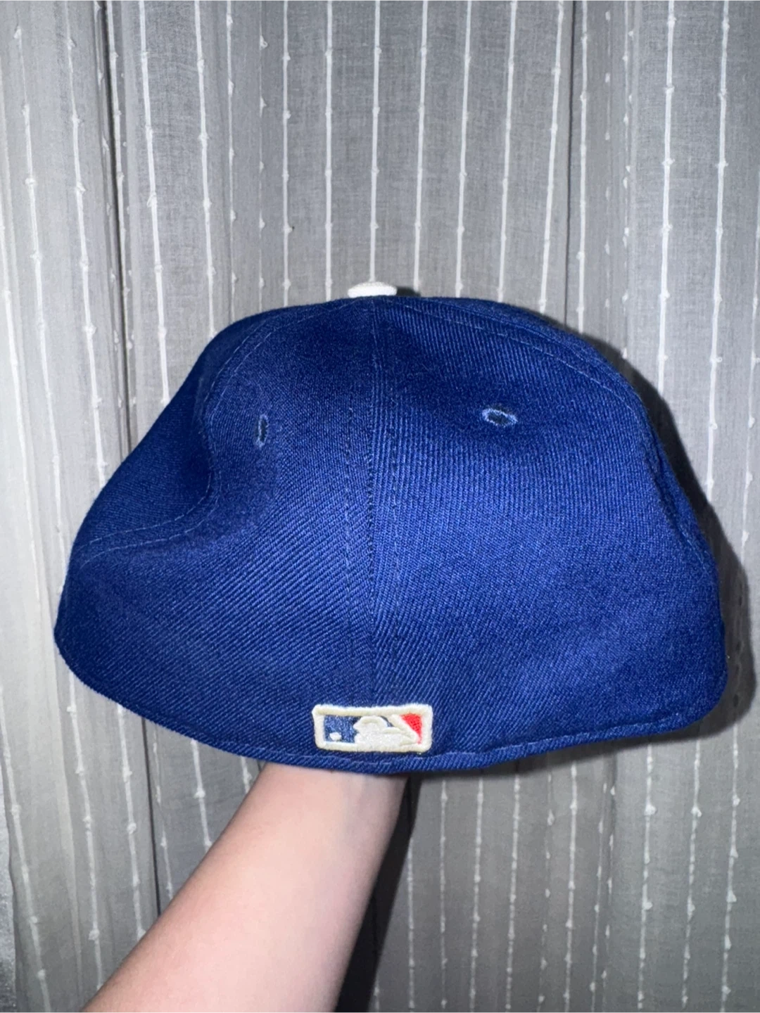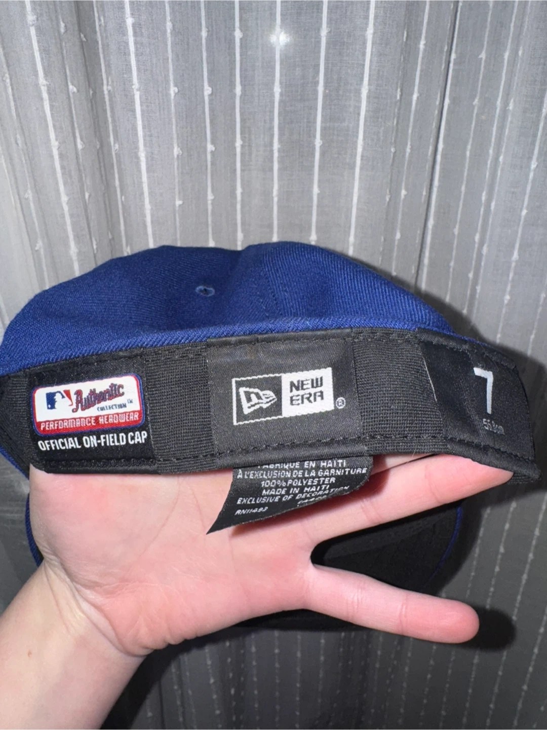 Selling a New Era LA Dodgers fitted hat in size 7. It's in great condition and ready for a new fan! The hat is blue with the LA logo on the front and the MLB logo on the back. It's made of 100% polyester.