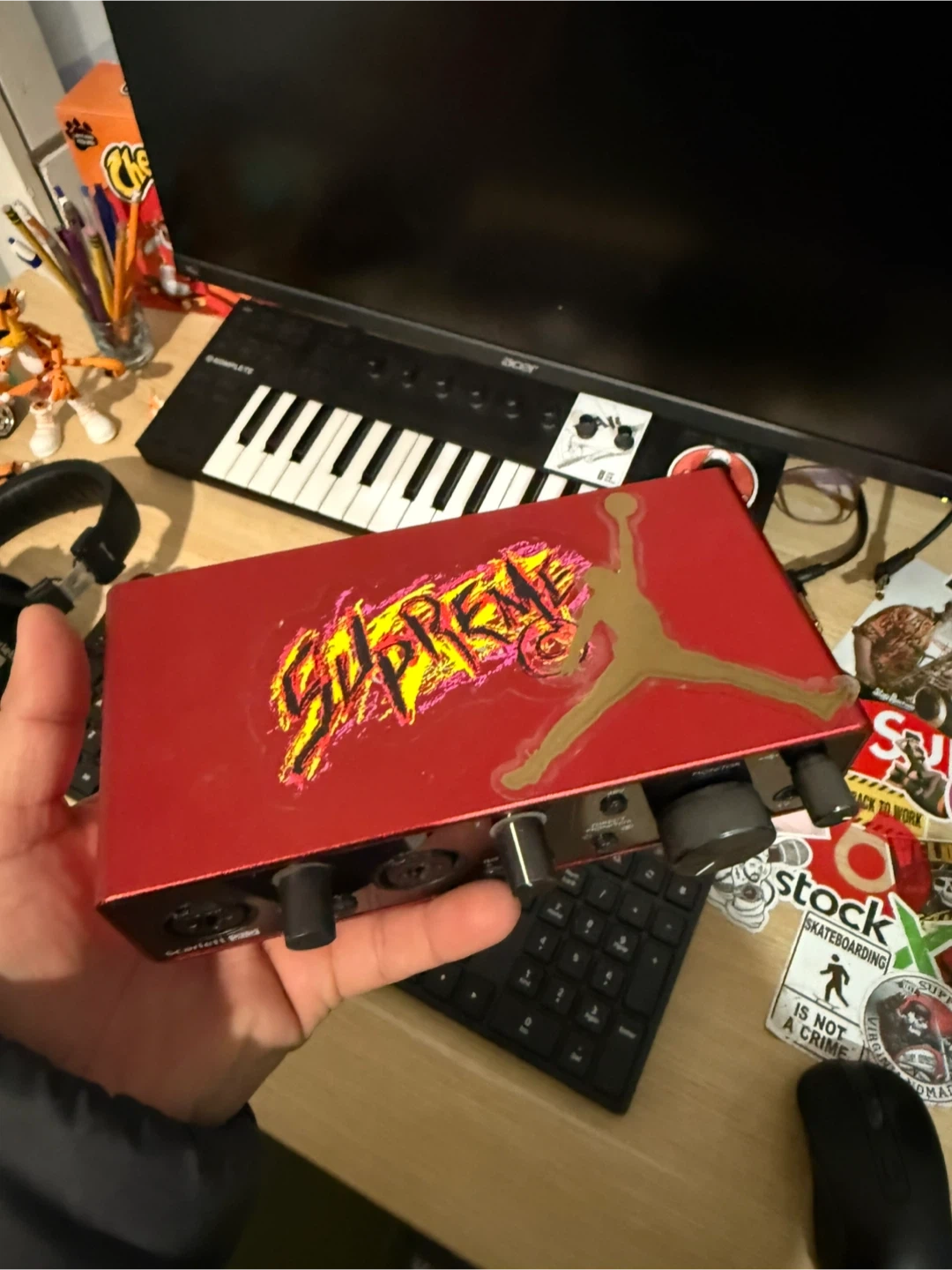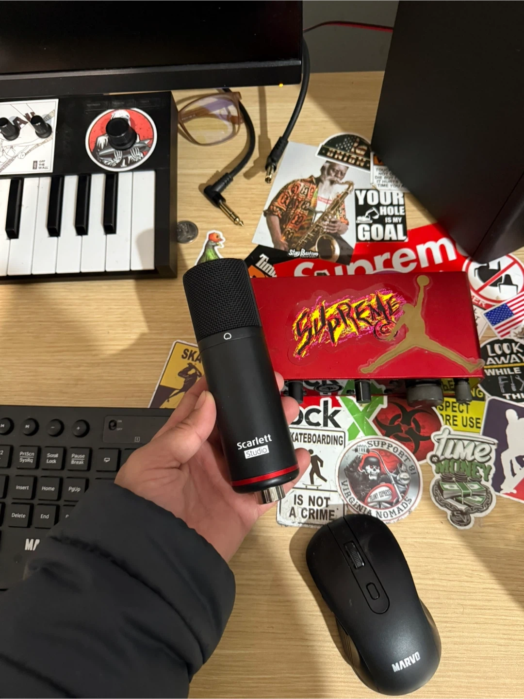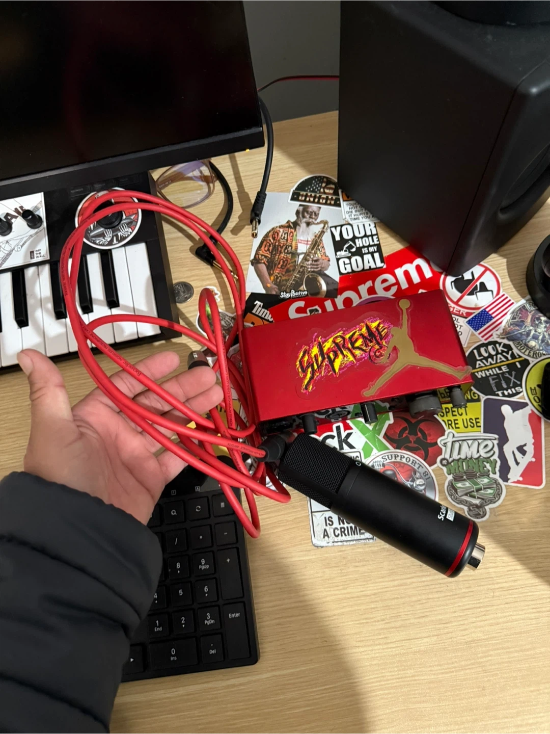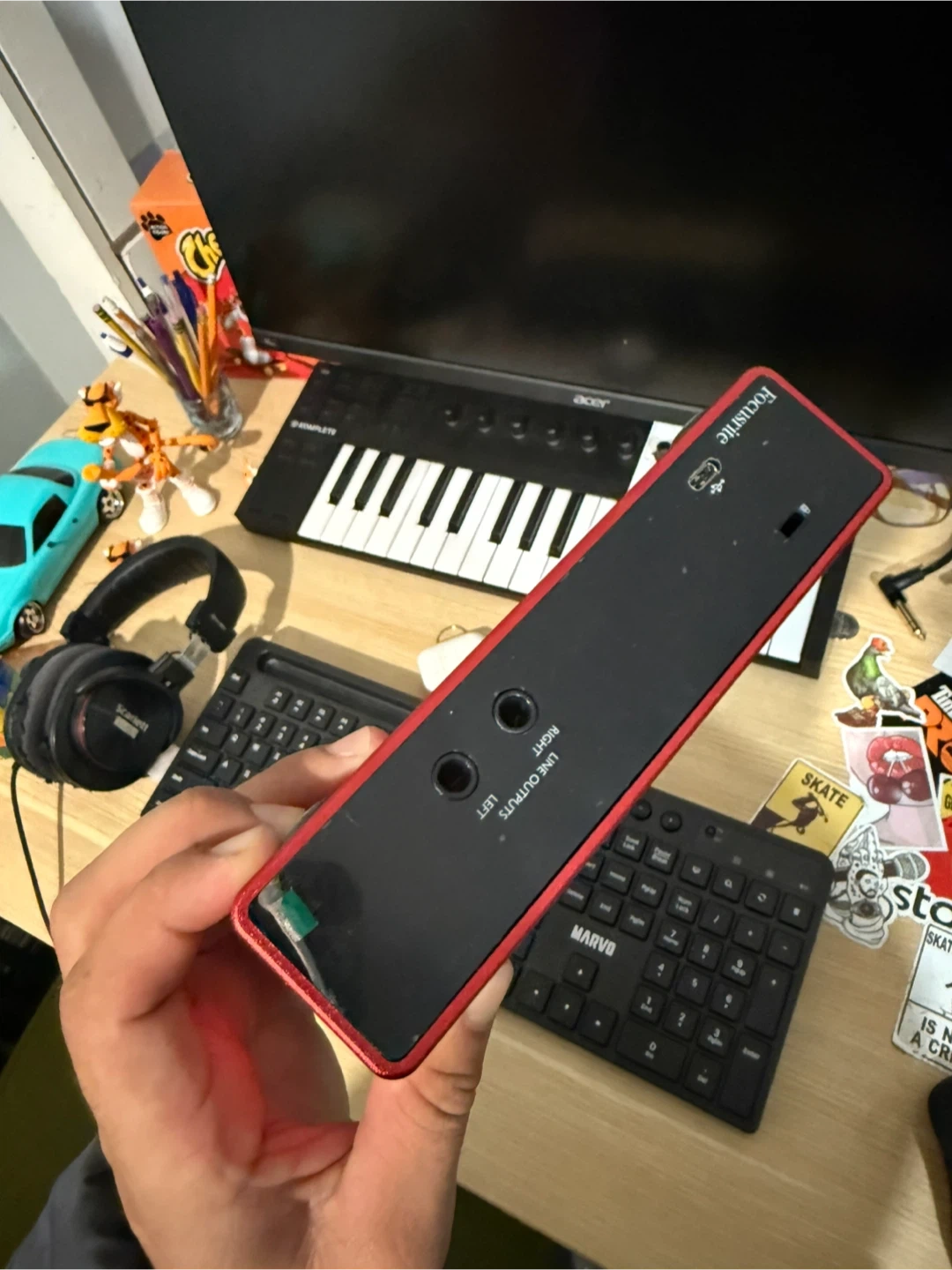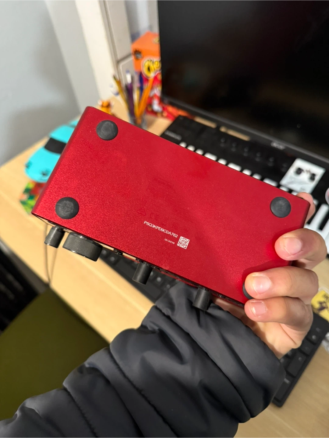 Selling a Focusrite Scarlett 2i2 audio interface! and microphone It's in good condition and ready for your music production needs. It has a red finish and features the Scarlett 2i2 interface. Perfect for recording vocals and instruments!