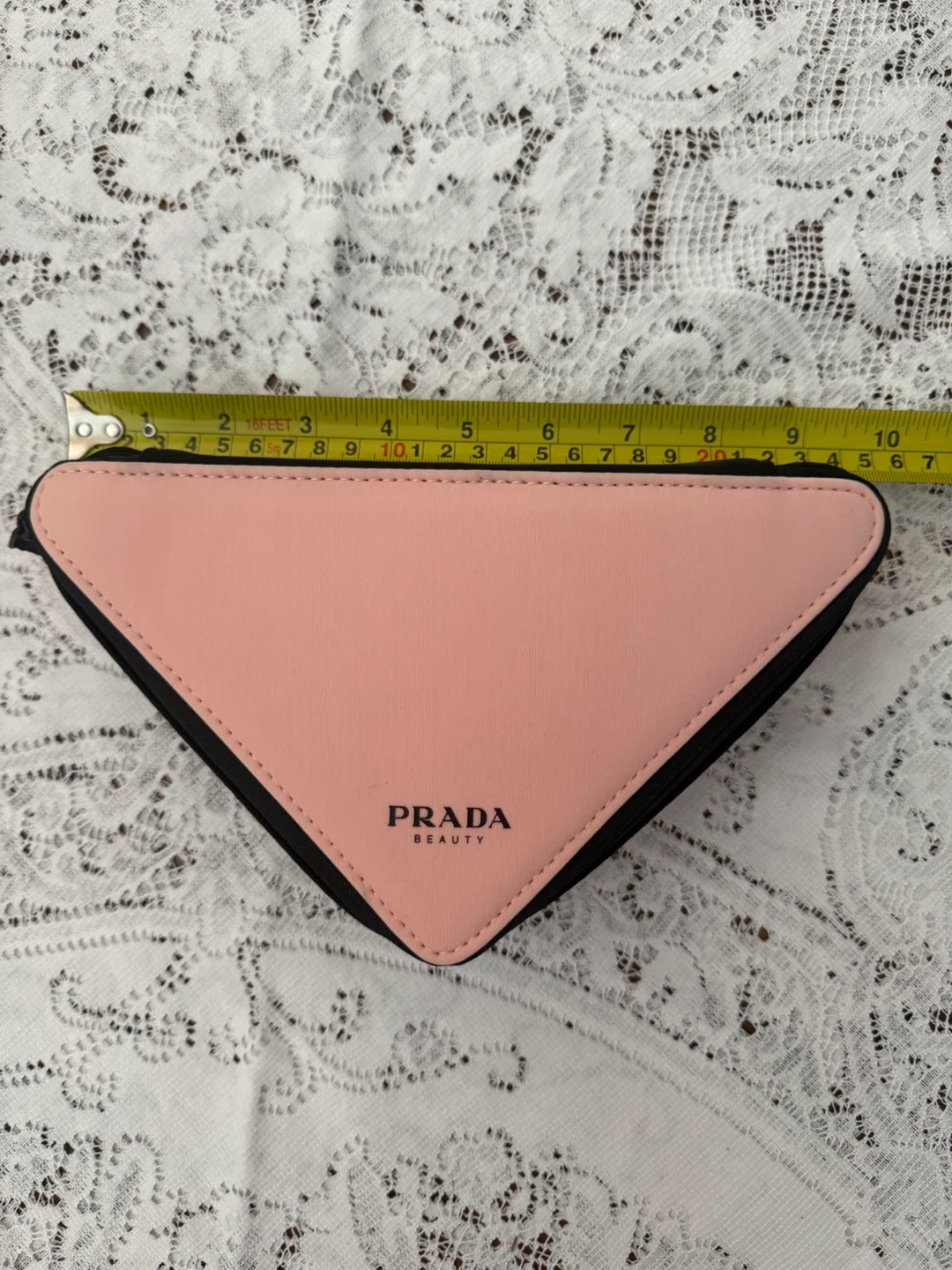 β’ Design: Iconic Prada triangle shape in a stylish soft pink with black trim.