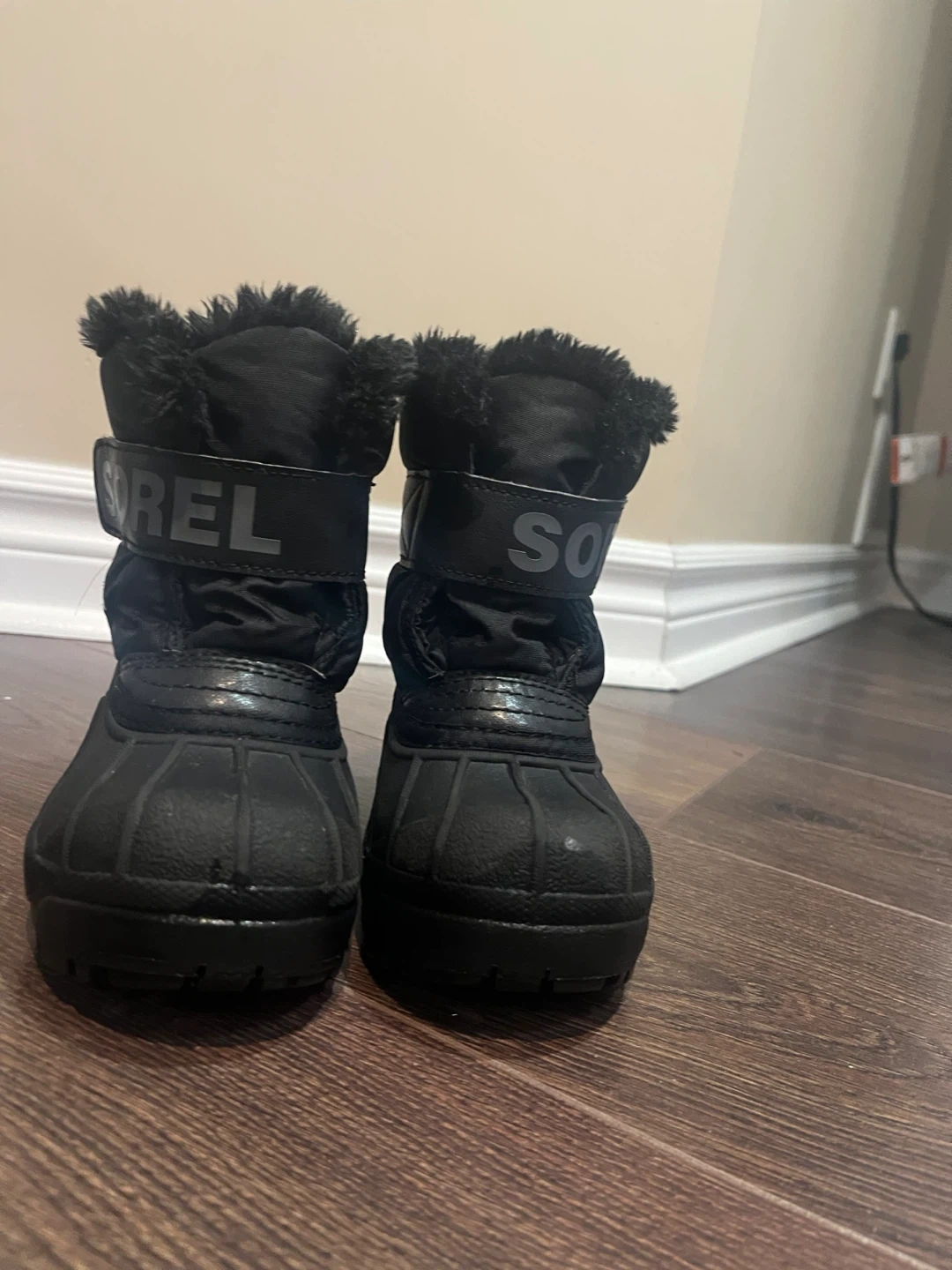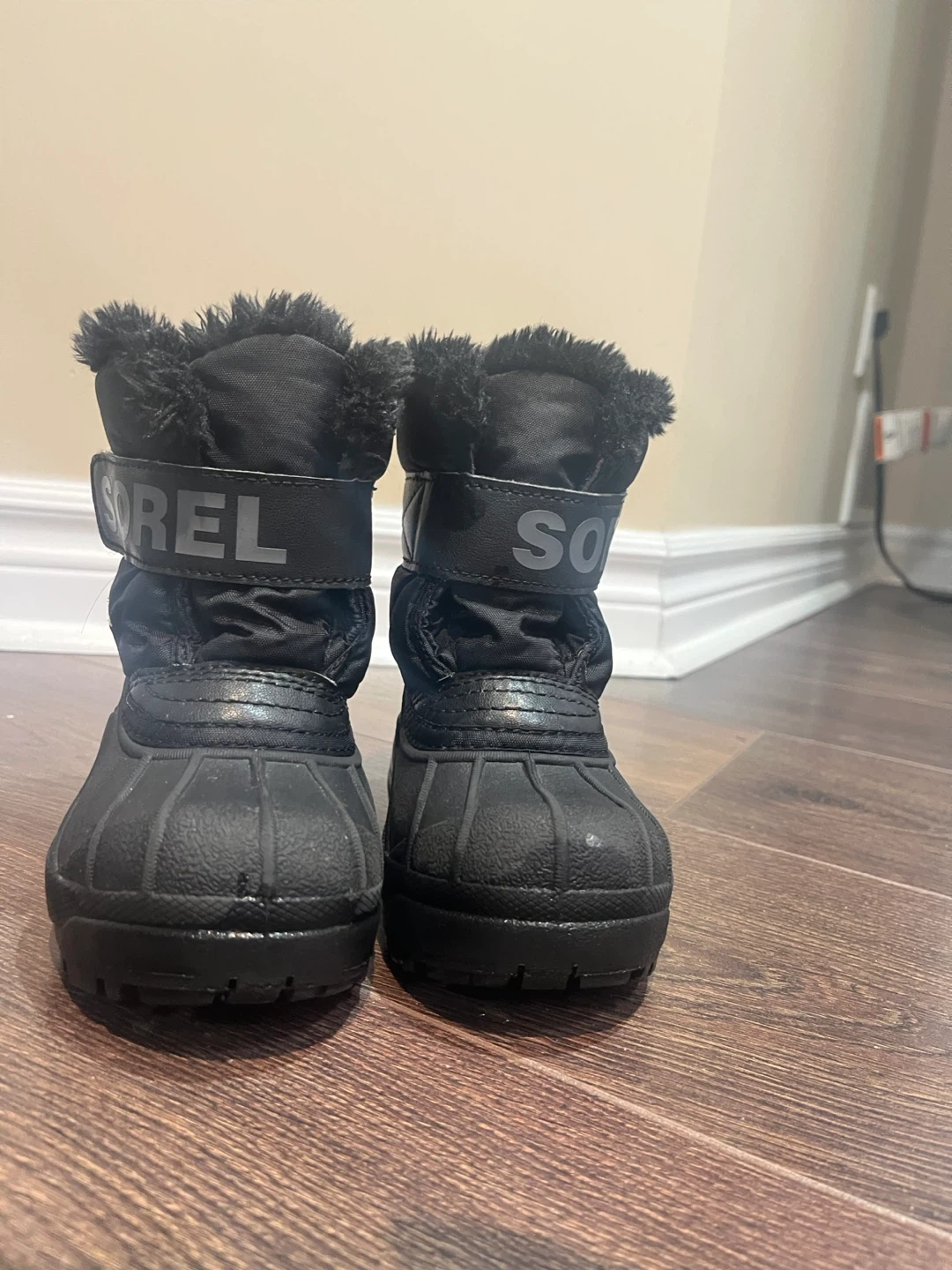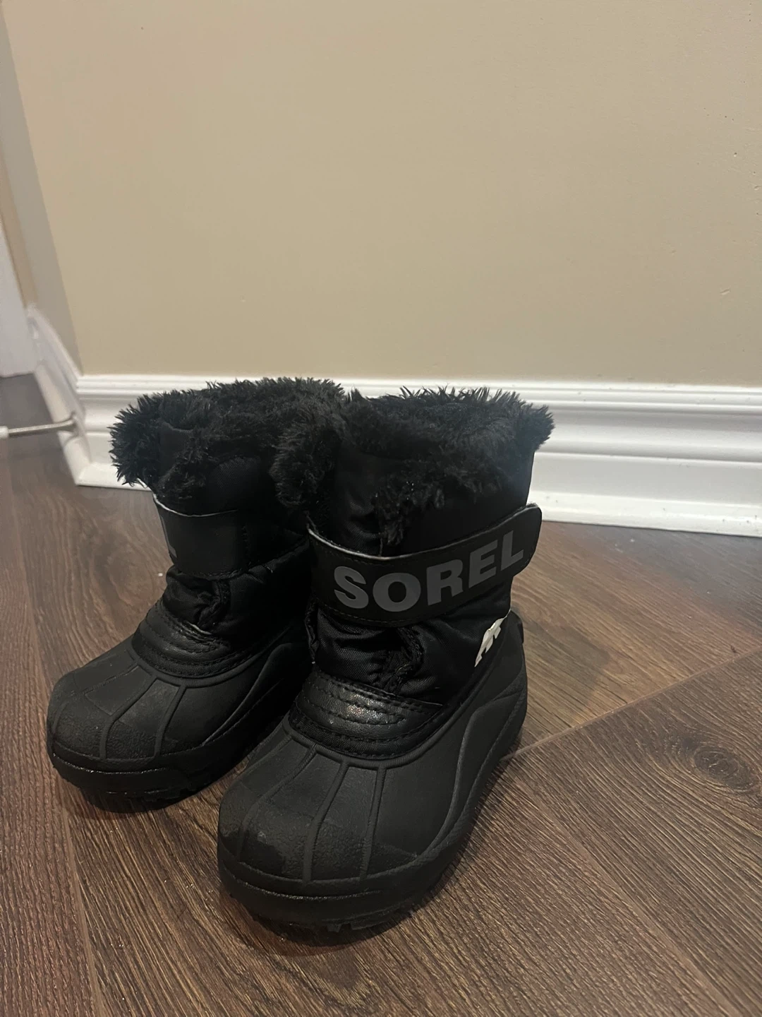 These are a pair of Sorel winter boots in black, perfect for keeping little feet warm and dry! They are size 8 and have a cozy faux fur lining. They are in good condition with some signs of wear.