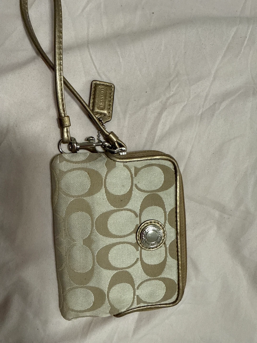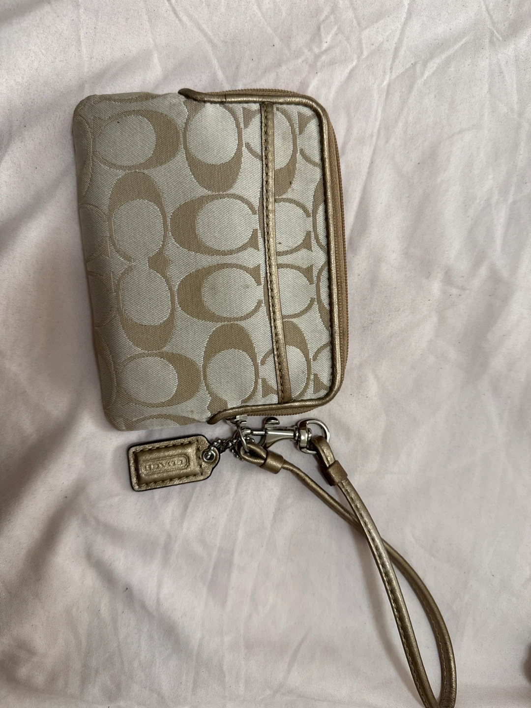 Selling a cute Coach wristlet! It's in great condition and perfect for carrying your essentials. It features the classic Coach logo pattern and a convenient wrist strap.