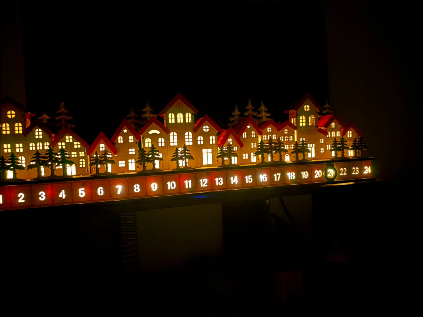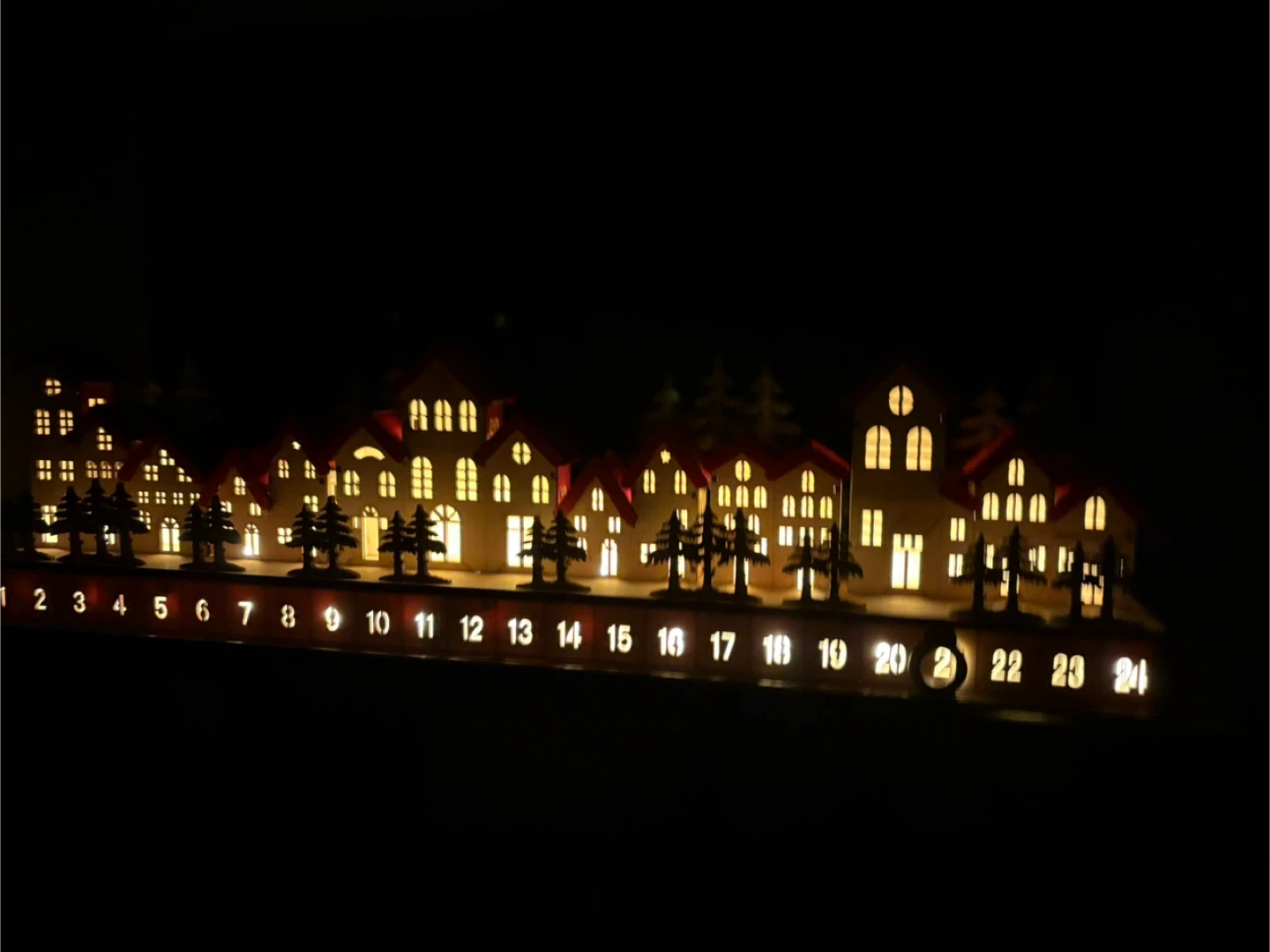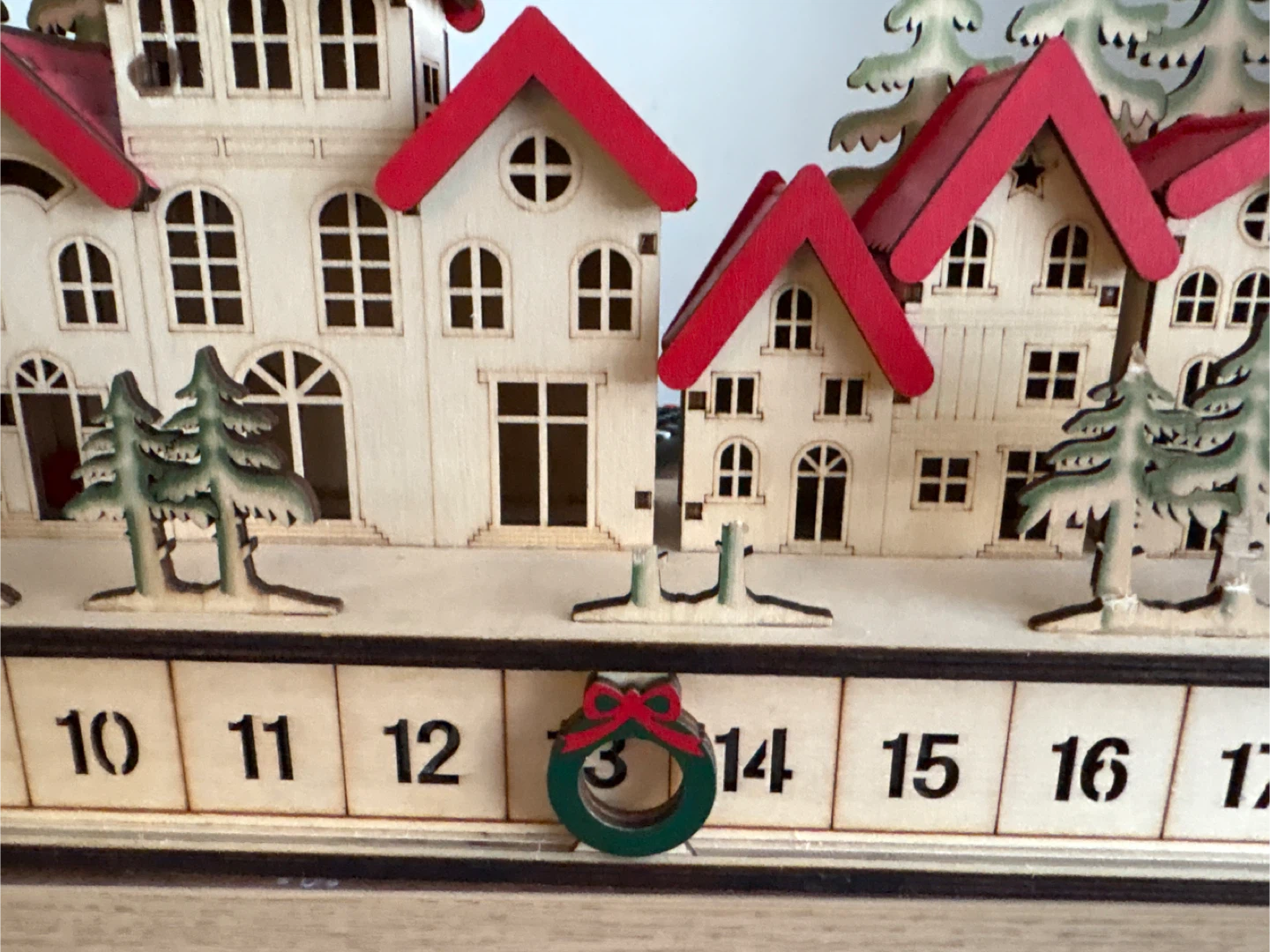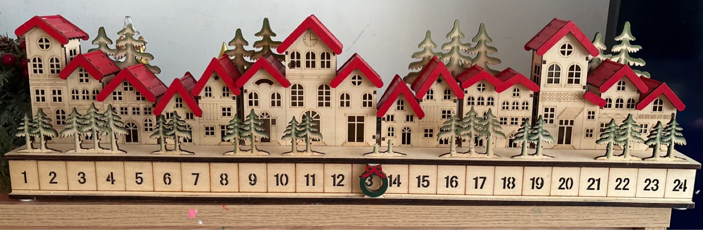 Wooden Christmas village advent calendar, lits up, battery needs to be replaced, 3 double A batteries 🔋