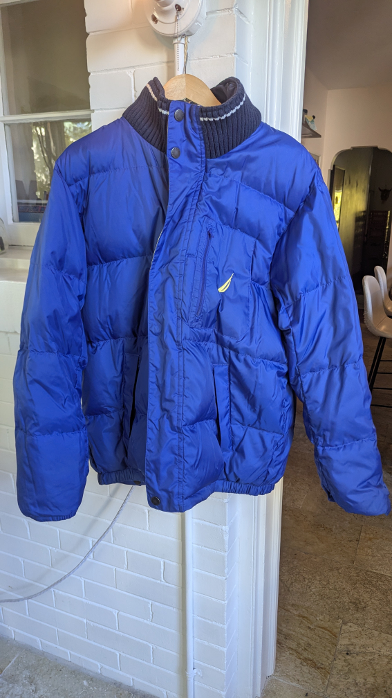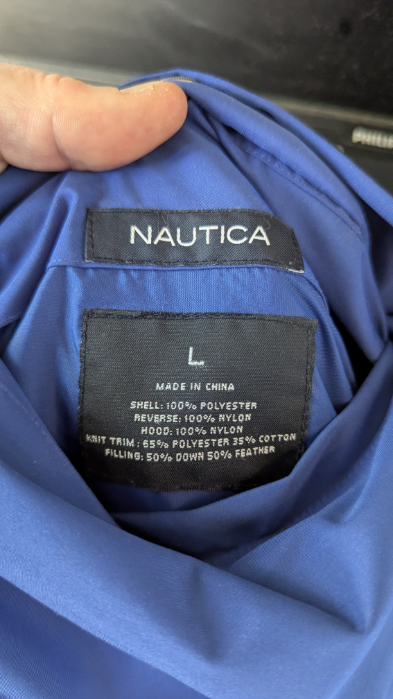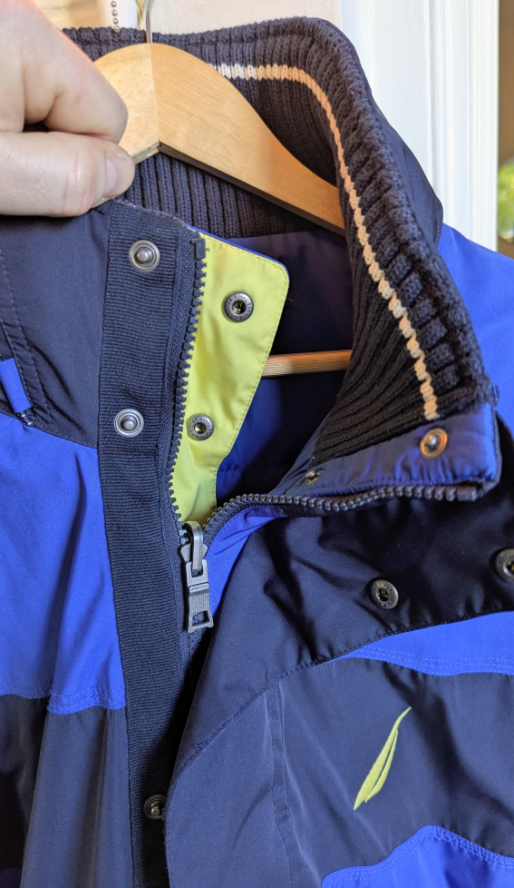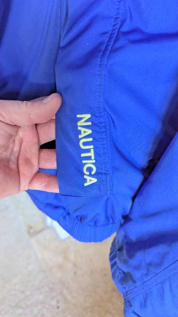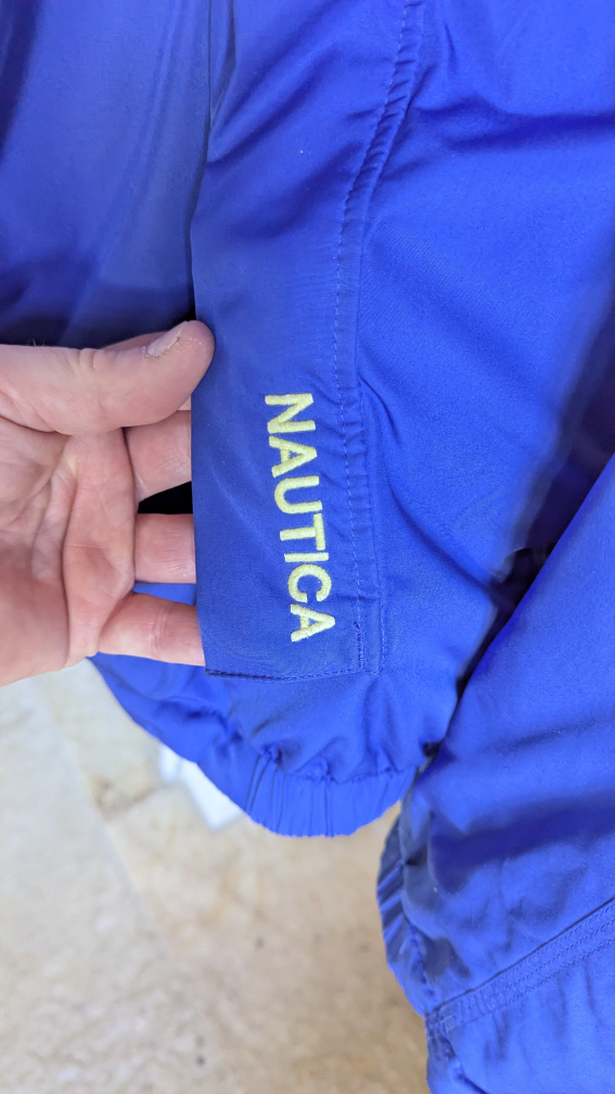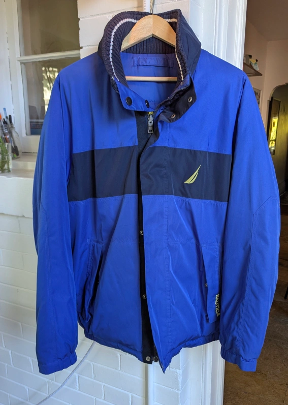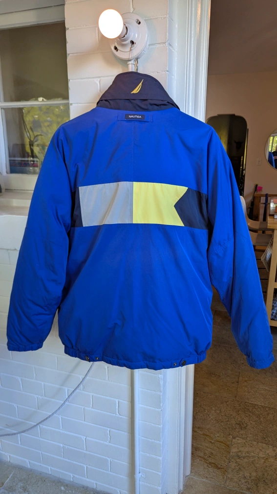 In great shape, clean. Has a fold out hood that is stored in the collar. Nautica fits big, so probably closer to a standard XL.