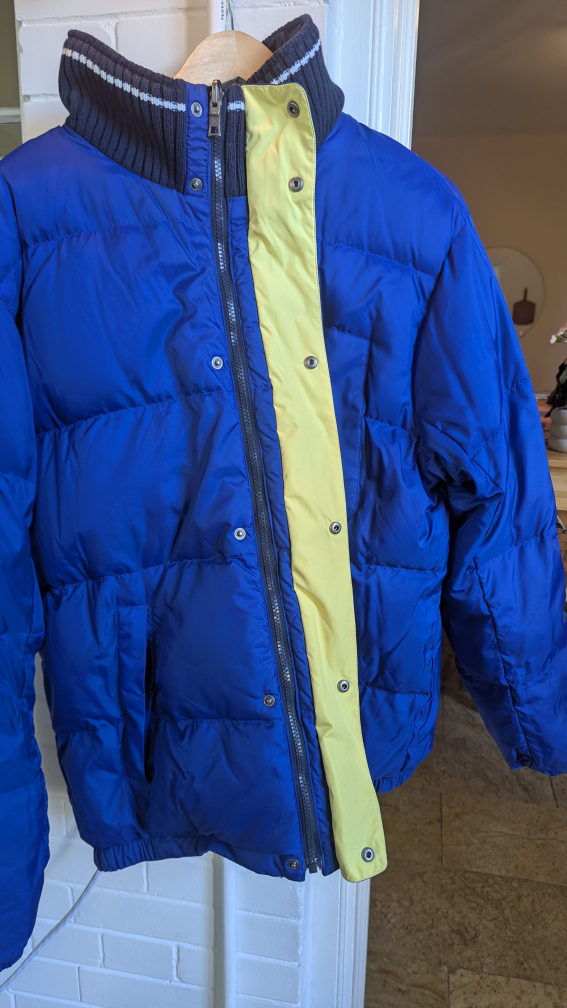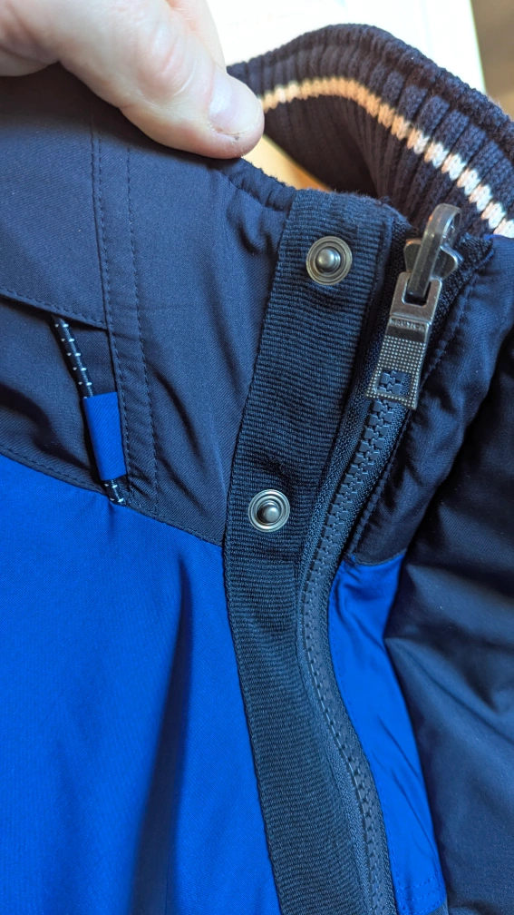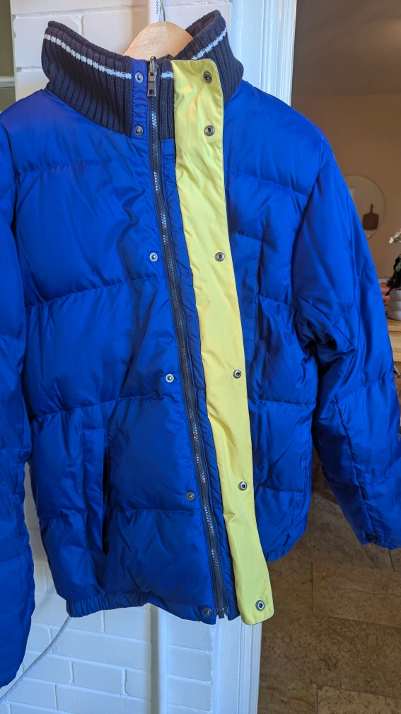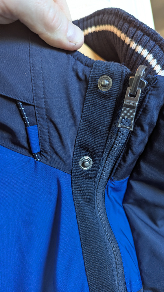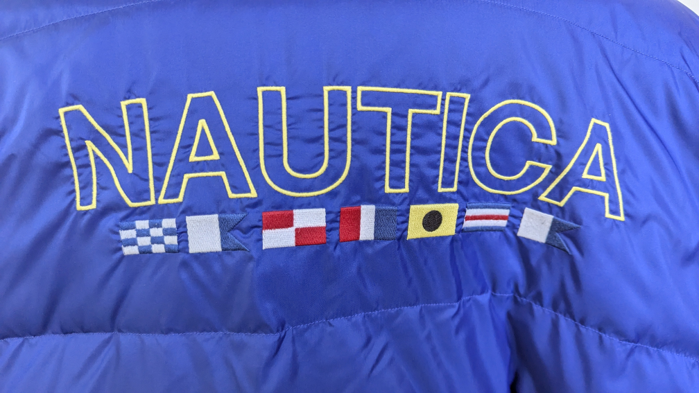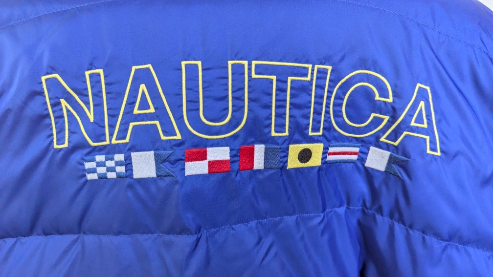 In great shape, clean. Has a fold out hood that is stored in the collar. Nautica fits big, so probably closer to a standard XL.