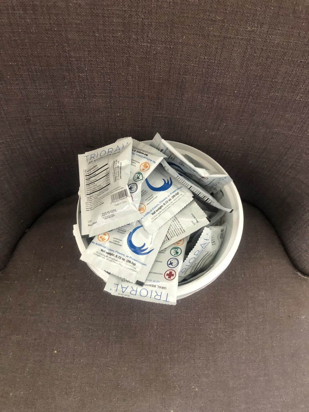 I have a bunch of Trioral Oral Rehydration Salts. They're great for dehydration, travel, hiking, and outdoor activities. Each packet contains 0.72 oz (20.5g) of salts. The best before date is December 2026