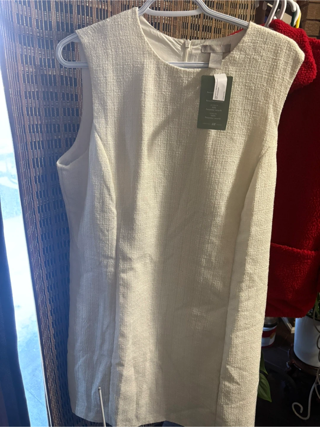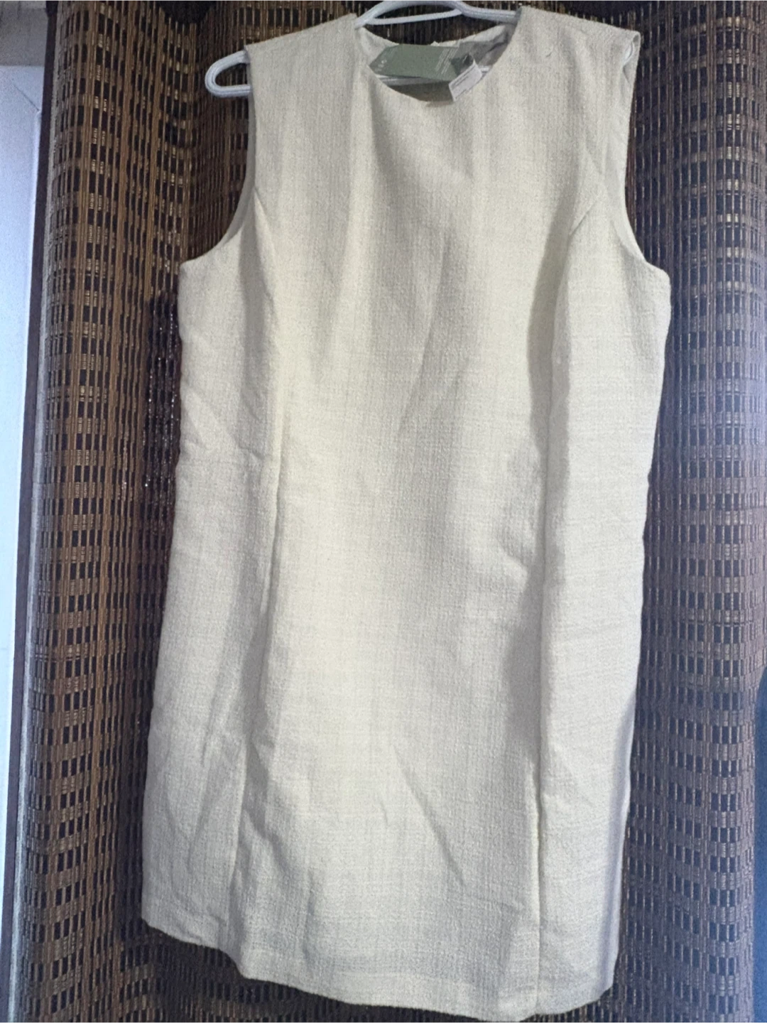 Selling a cute H&M sleeveless dress in cream colour. It's a size L and in great condition! Perfect for a casual day out or dressed up for an evening event