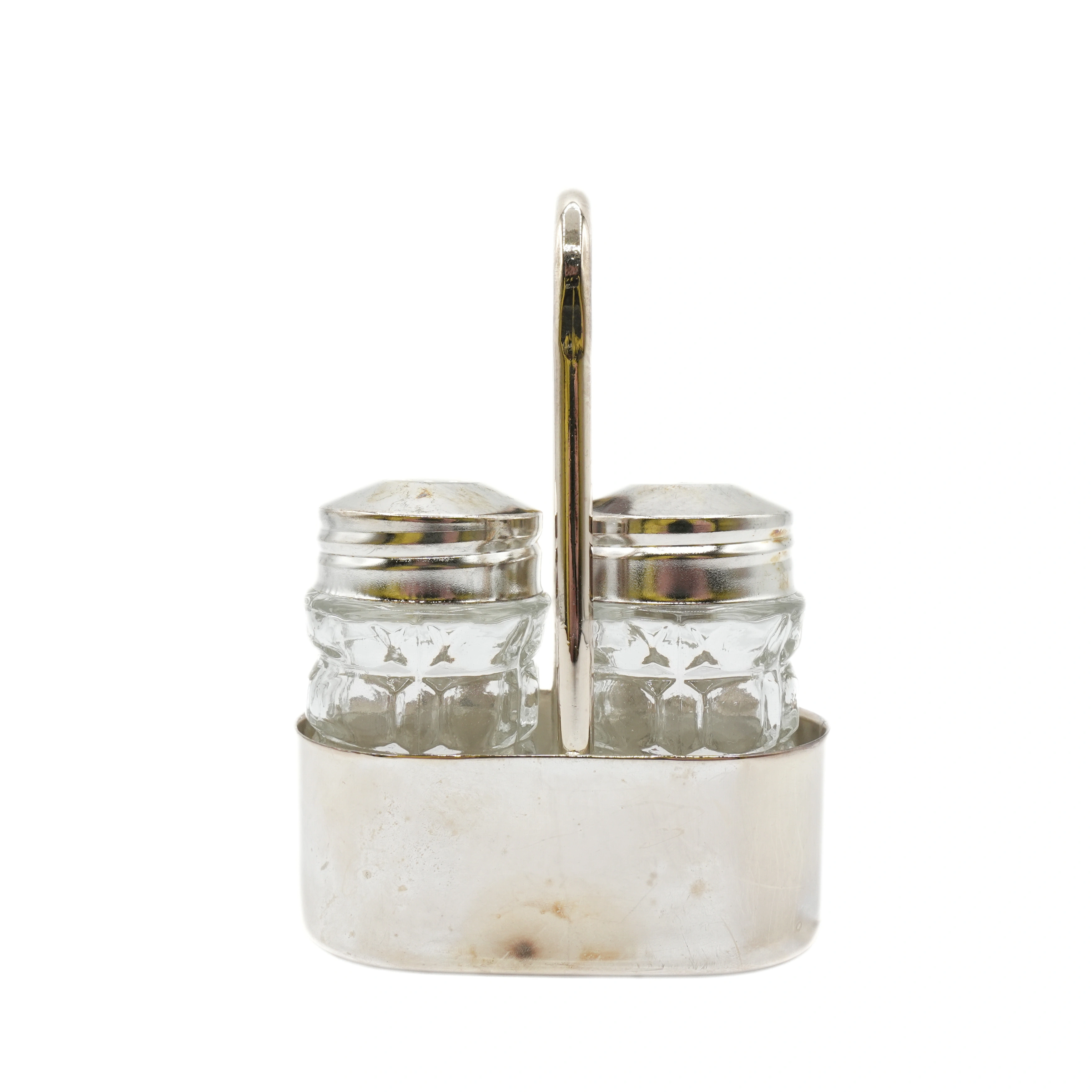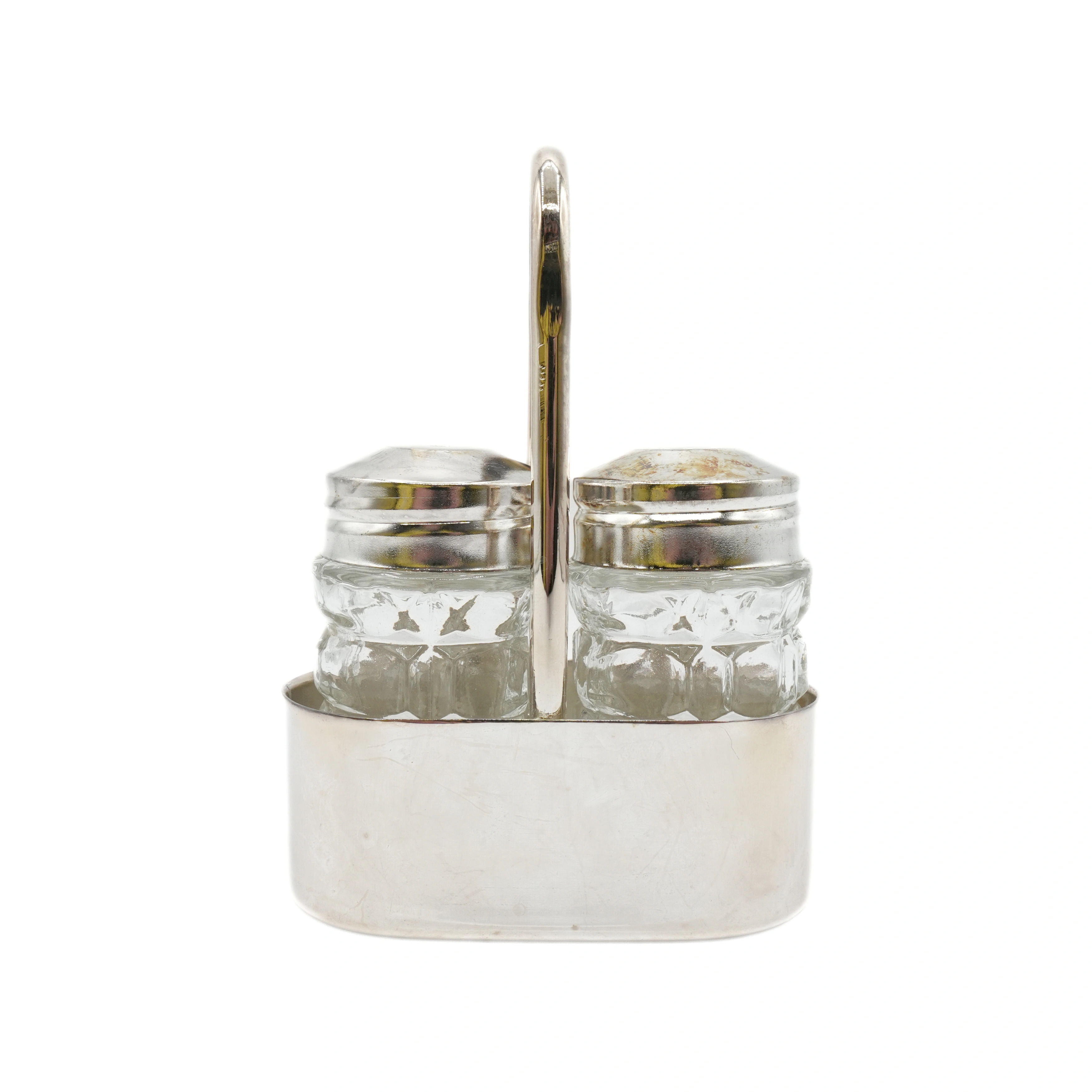 Here are some vintage salt and pepper shakers with a silver-tone holder! They have a classic design and would look great on any dining table. The shakers are made of glass with silver-tone lids. They show some signs of wear, but are still in good condition for their age