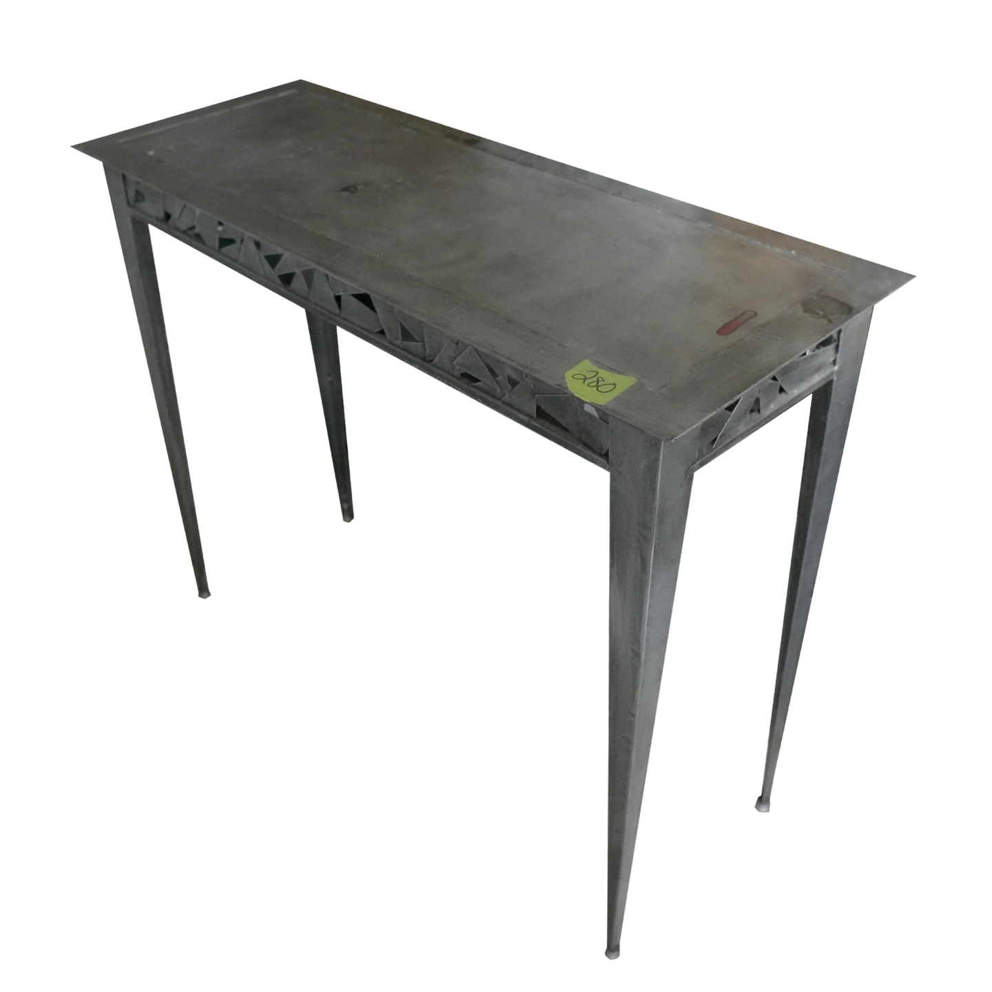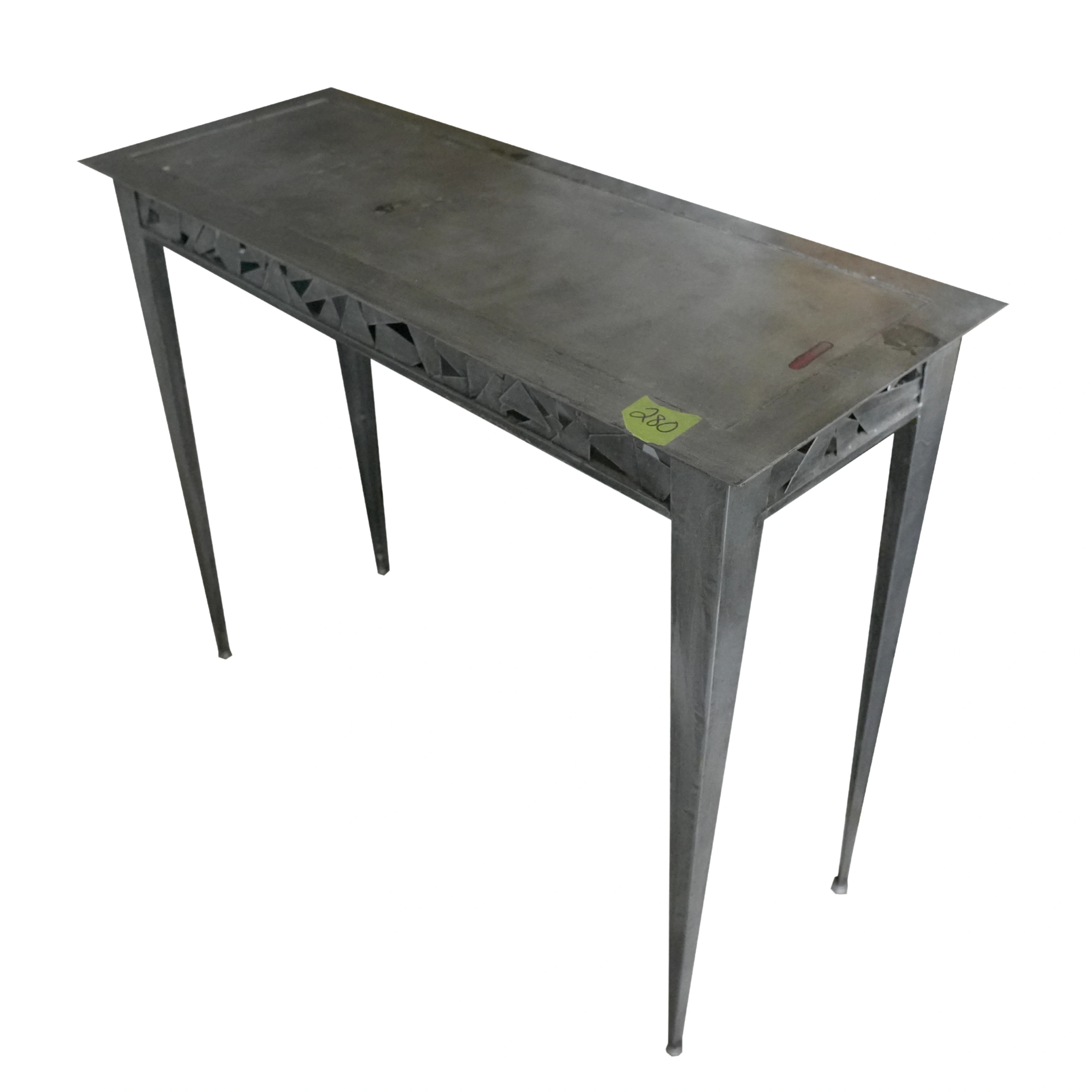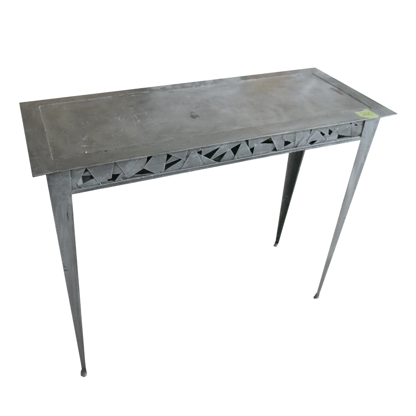 Selling a metal console table. It has a unique geometric design along the sides. Great for adding a touch of modern style to your home!