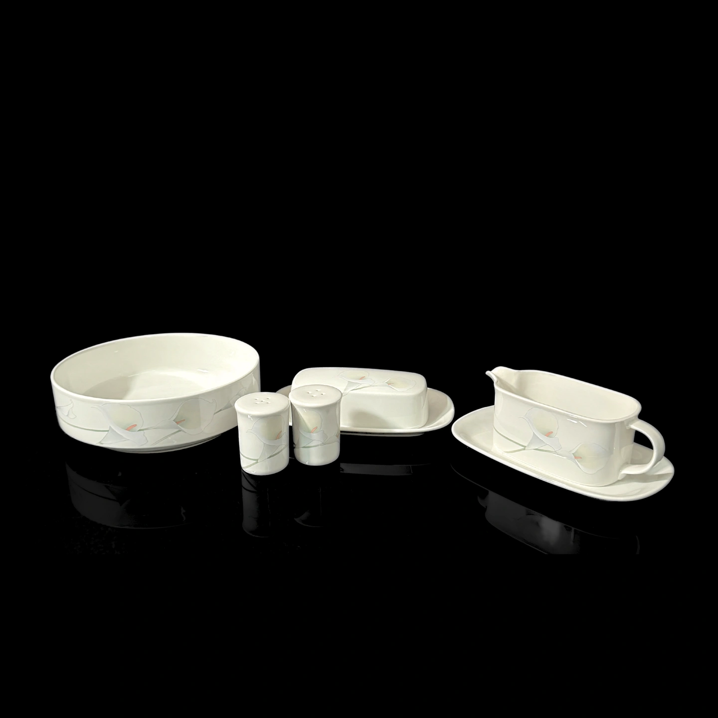 Selling a vintage Mikasa Whole Wheat Calla Lily set! This beautiful set includes a serving bowl, butter dish, salt and pepper shakers, and a gravy boat with a saucer. Perfect for adding a touch of elegance to your dining table
