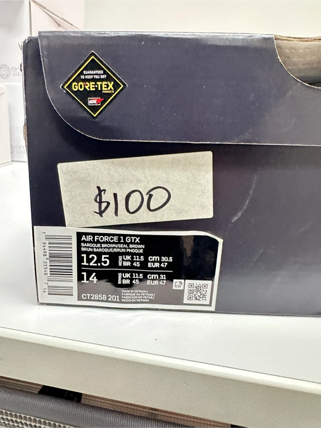 Selling a brand new pair of Nike Air Force 1 GTX in Baroque Brown. These are a size US 12.5. They are waterproof thanks to the Gore-Tex material. Comes with the original box!