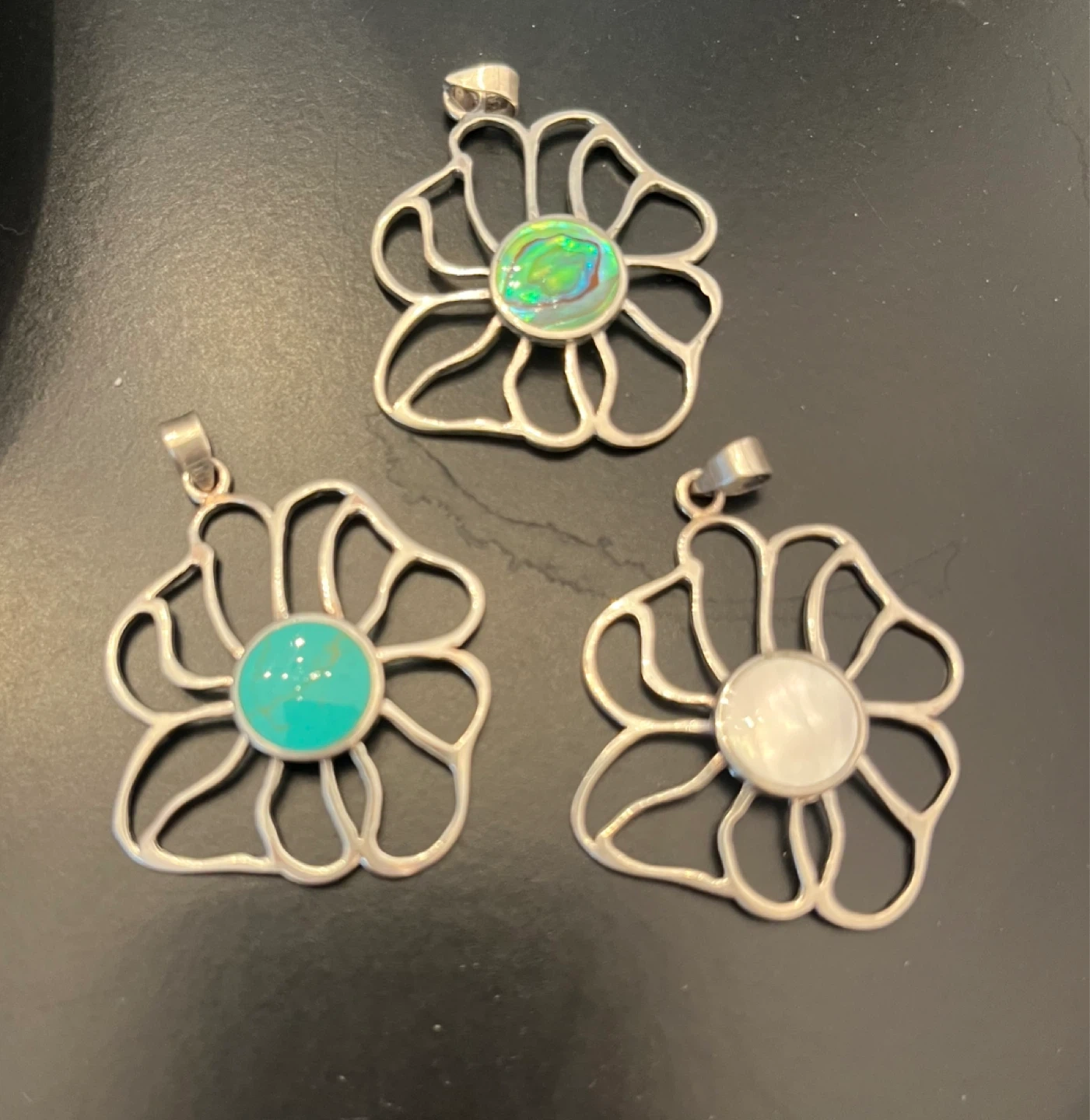 3 flower pendants for sale, each featuring a different coloured centre stone. Silver stamped 925. Pendants only, no chain.