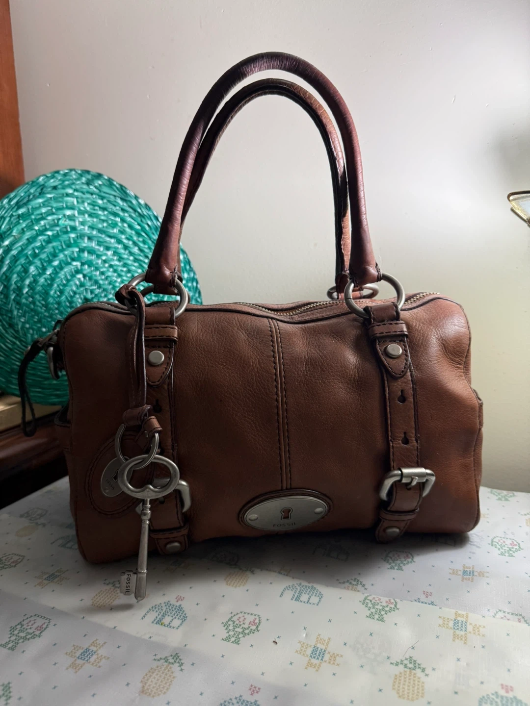 Selling a gently used Fossil handbag in brown leather. It's in good condition and comes with the signature Fossil key charm. Perfect for everyday use!