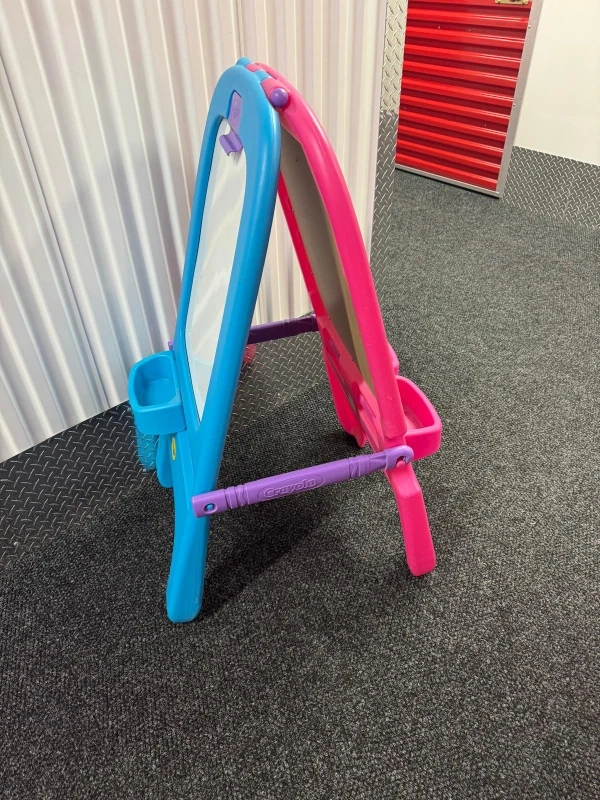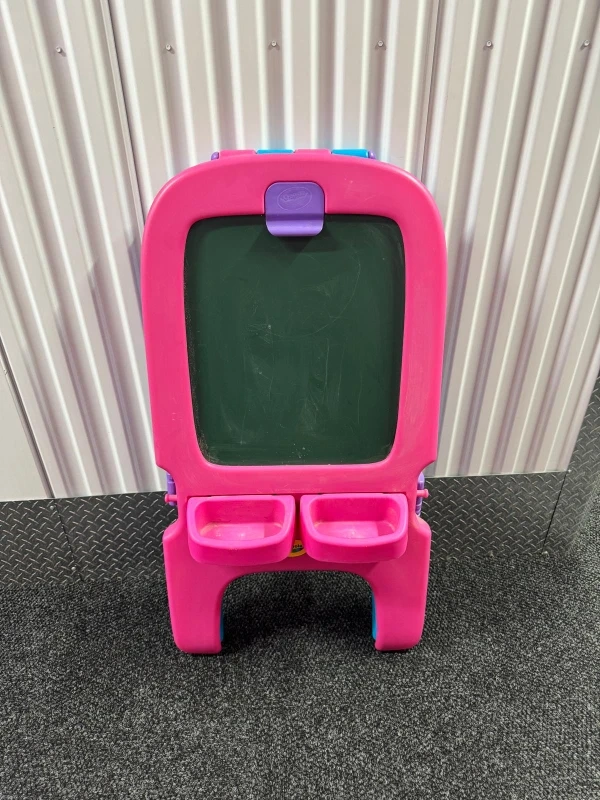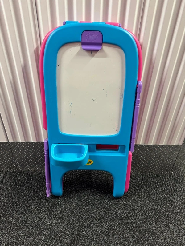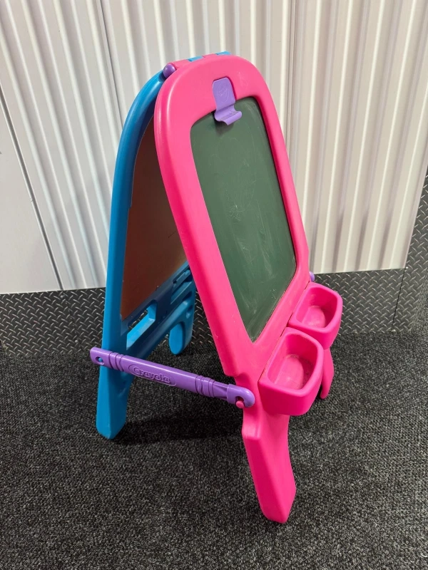 This Crayola easel is perfect for young artists! It features a double-sided design with both a chalkboard and a whiteboard. The easel is pink and blue and includes a purple bar for holding art supplies.