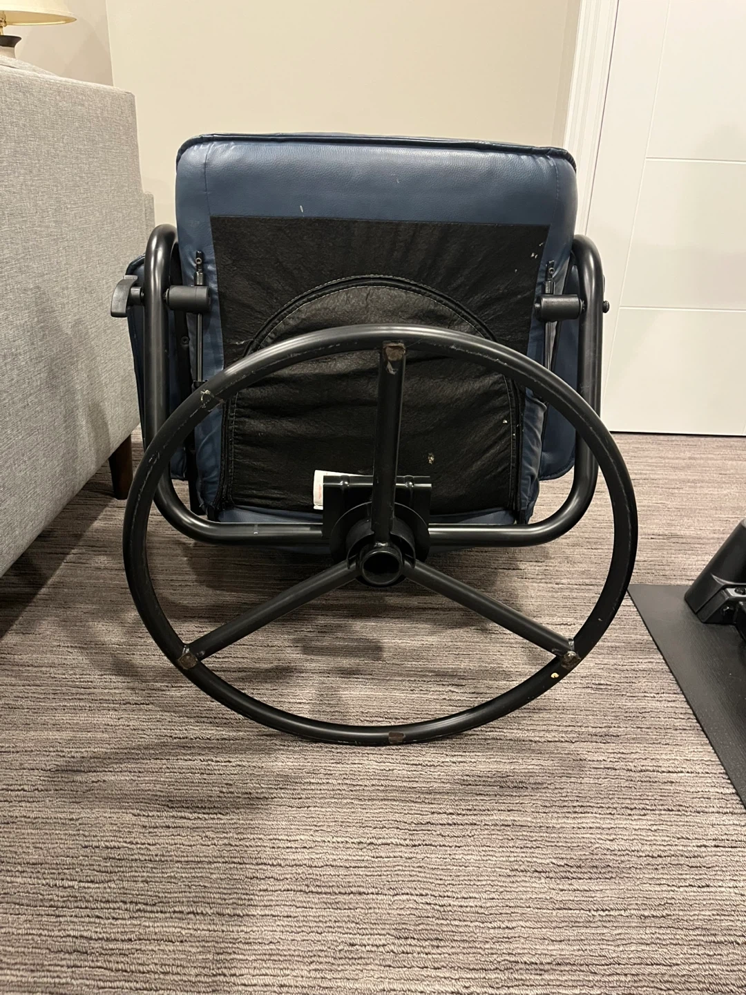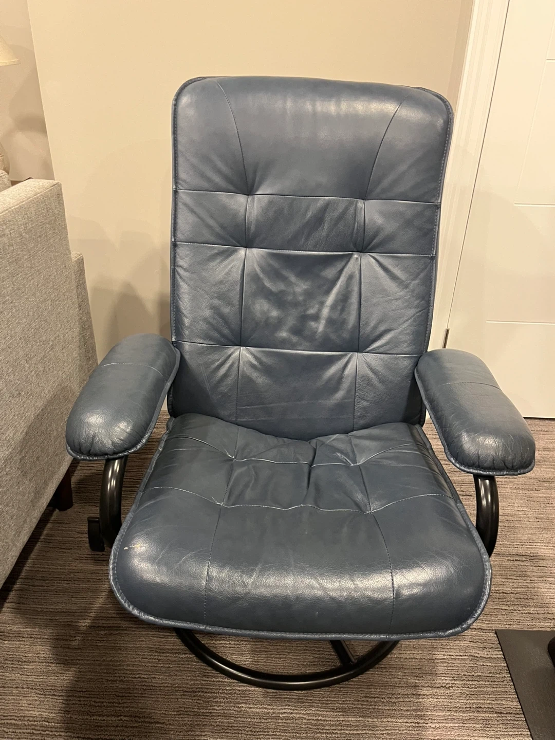 Blue Leather chair. Reclines. Measurements 16 inches to seat, 30 inches wide, 24 inches in depth and 39 high at the back. Small mark on the seat.
