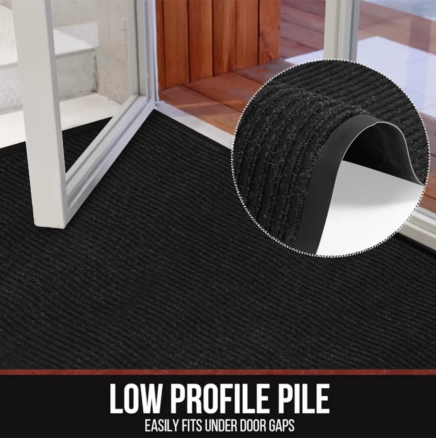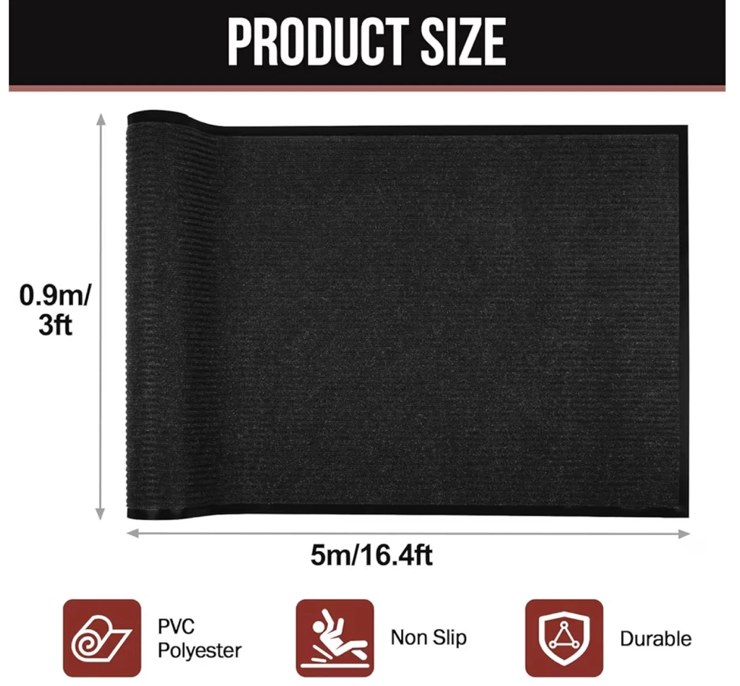 This black mat is perfect for either indoor or outdoor use! It measures 3ft by 16.4ft (0.9m x 5m). It's made of PVC polyester and is both non-slip and durable, making it a great choice for high-traffic areas