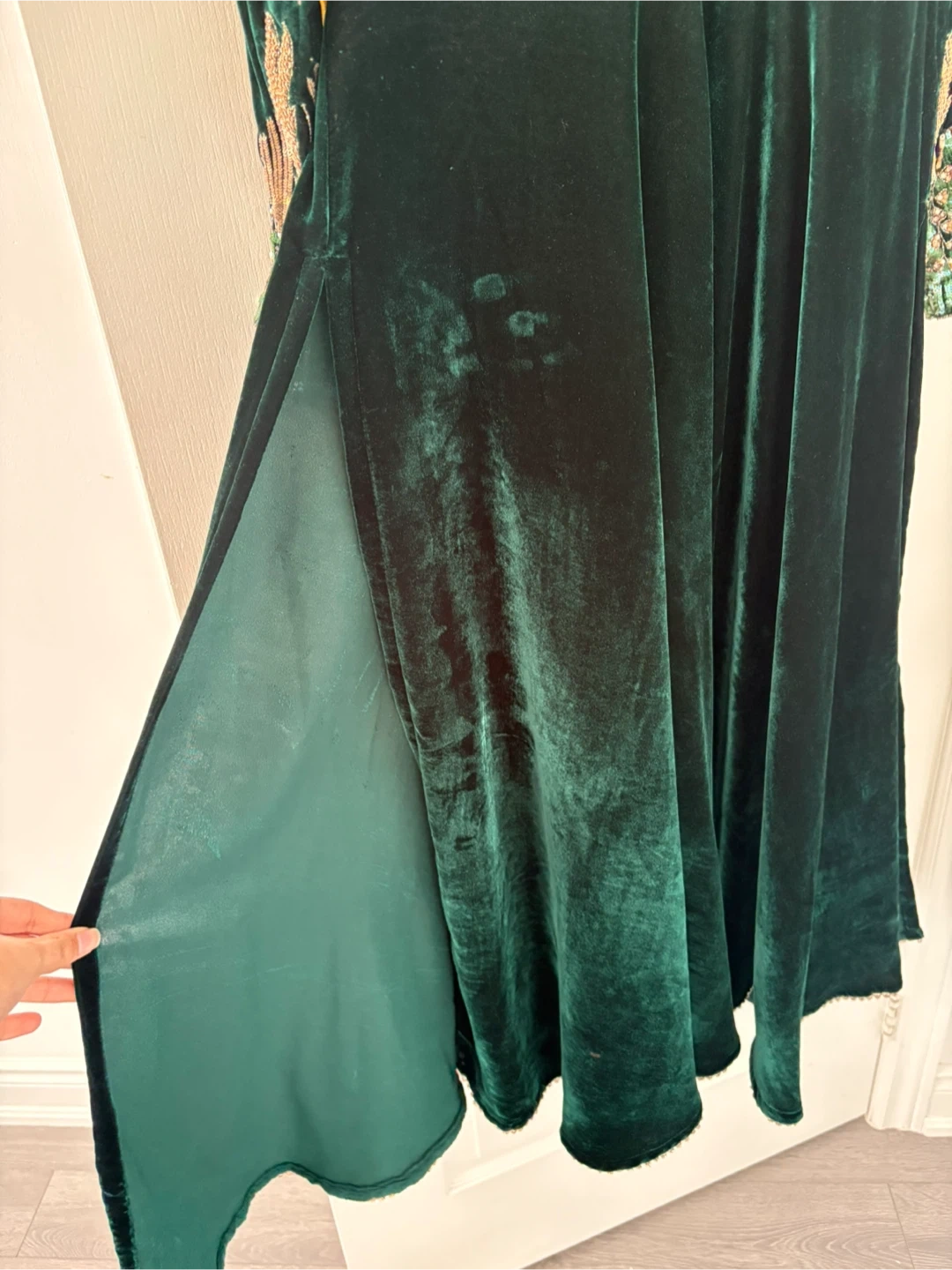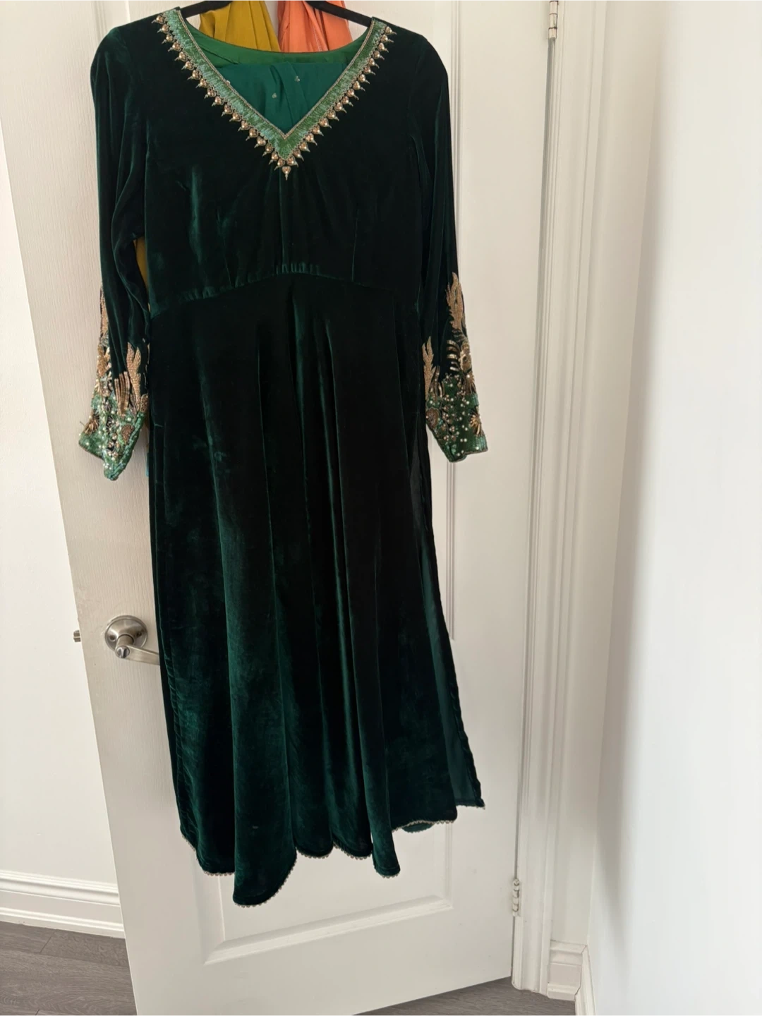Selling a lovely anarkali velvet dress! It's a beautiful colour and the velvet material feels so luxurious. Perfect for a special occasion or just to feel a bit fancy. It is velvet material comes with green tights and a net dupatta. This is a custom made piece