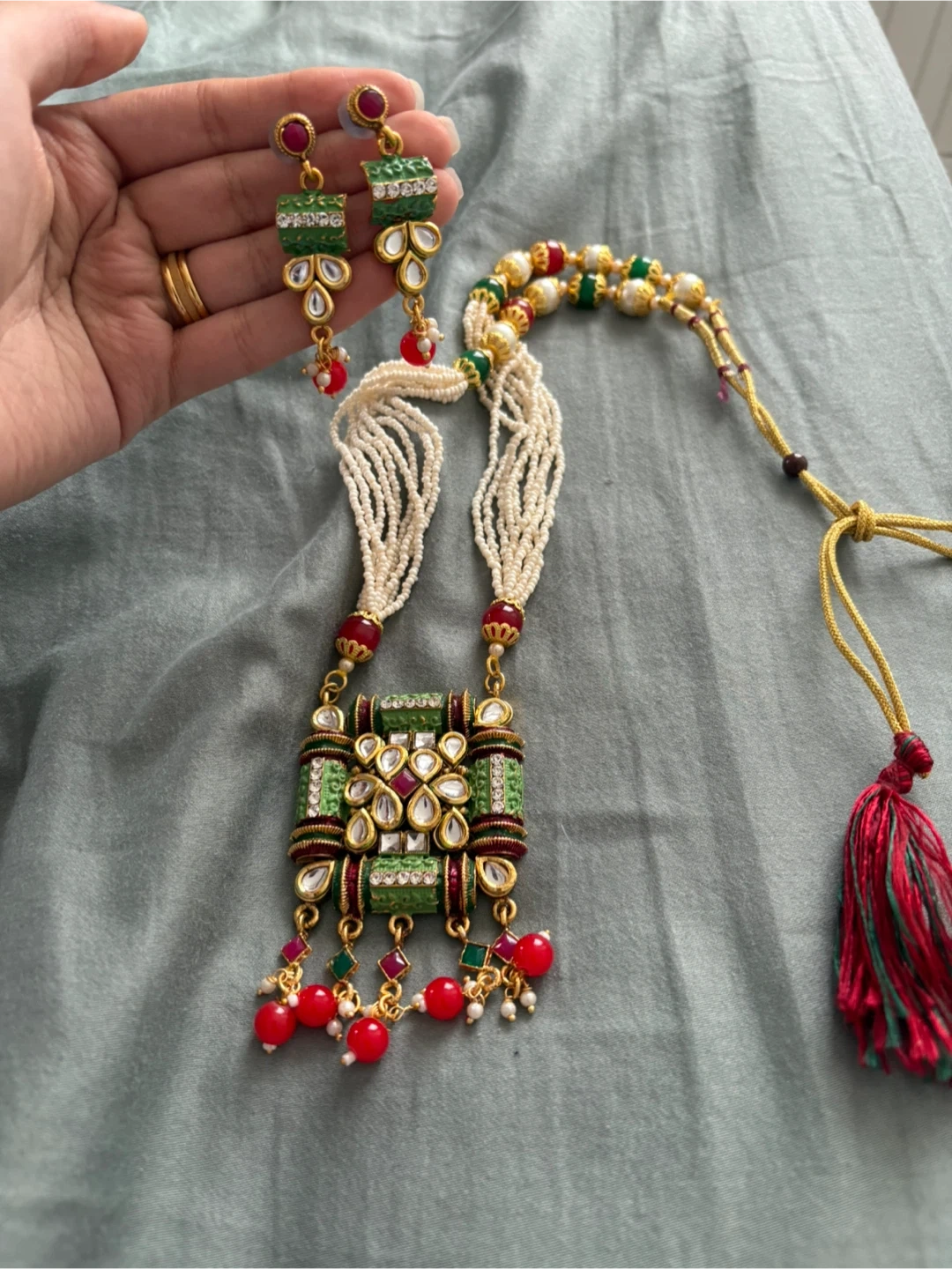 Beautiful necklace and earring set with green, red, and pearl-coloured beads. Perfect for adding a touch of elegance to any outfit!