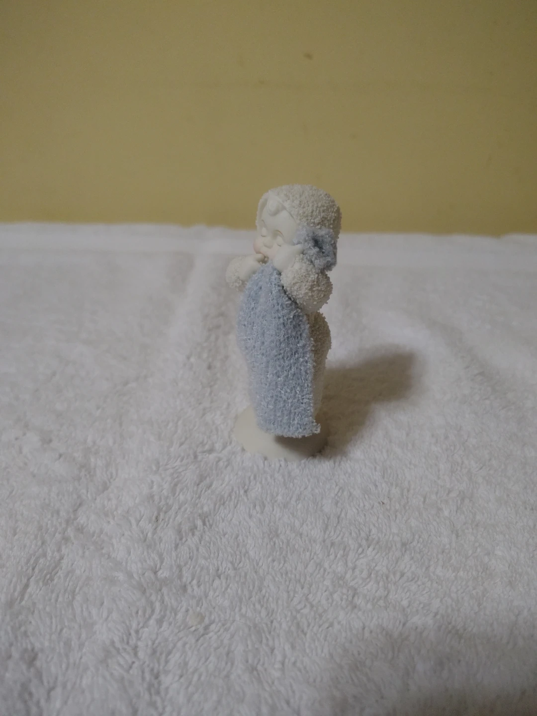 This is a Snowbabies figurine called "Sleepyhead". It features a baby in a snowsuit holding a blue blanket. It's in great condition and would be a lovely addition to any collection!