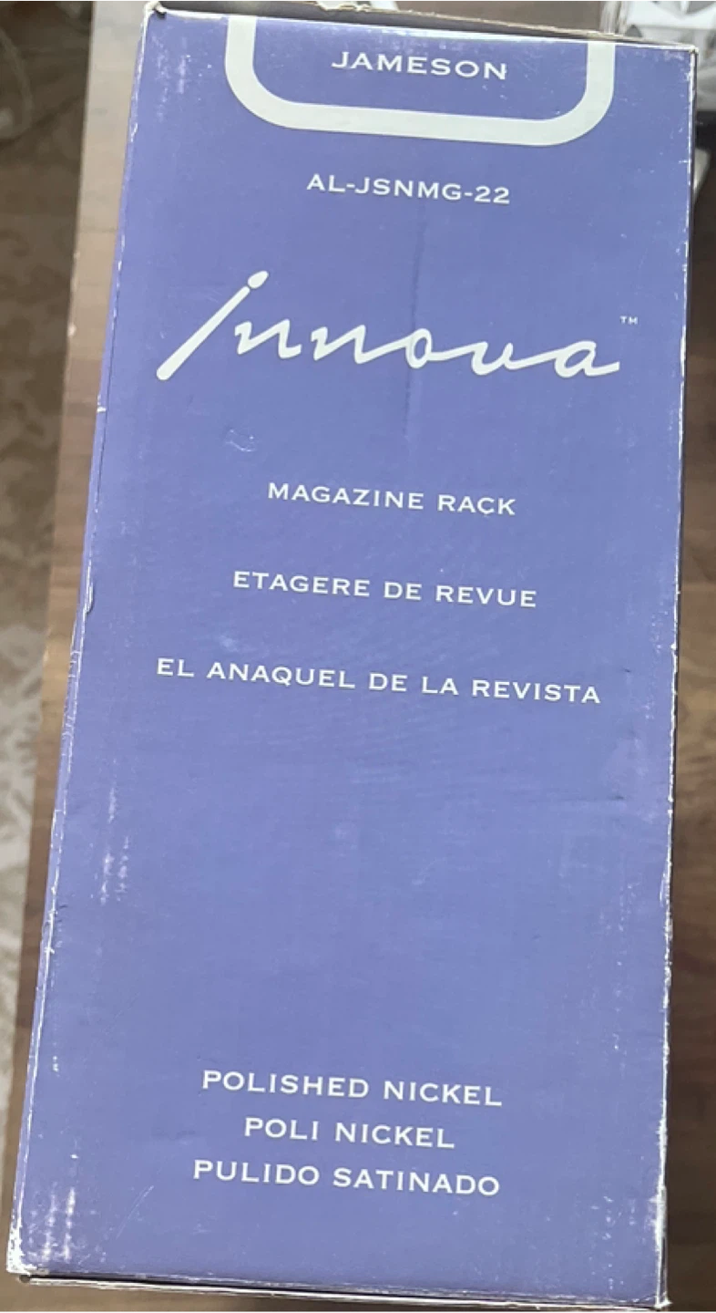 Selling a new Innova Jameson Collection magazine rack in polished nickel! It comes with all the original components and instructions, still sealed in their packaging. The box is included as well!