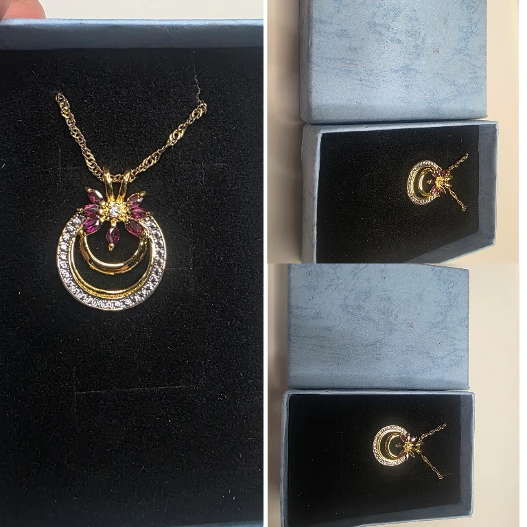 Selling a beautiful gold-tone necklace with a unique pendant. It features a circular design with sparkling stones and a delicate floral accent. Comes in its original box, making it perfect for gifting or keeping it safe. The necklace is in new condition and ready to add a touch of elegance to any outfit