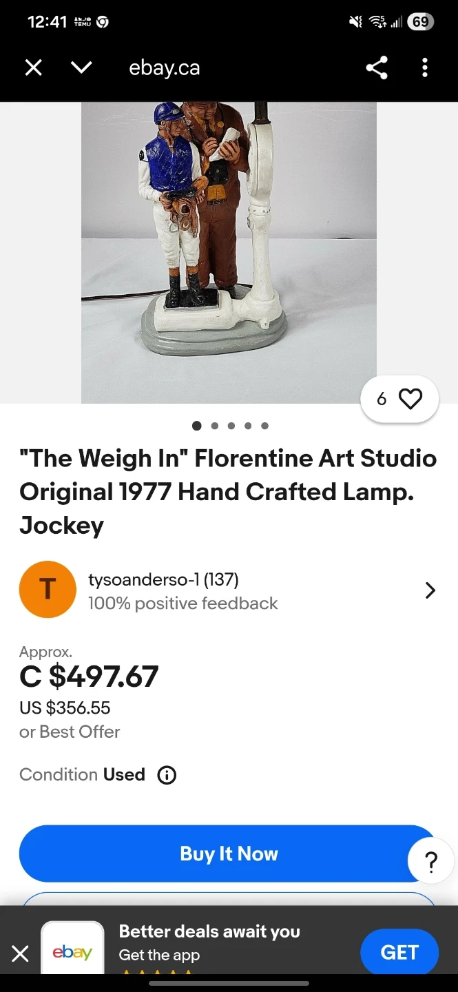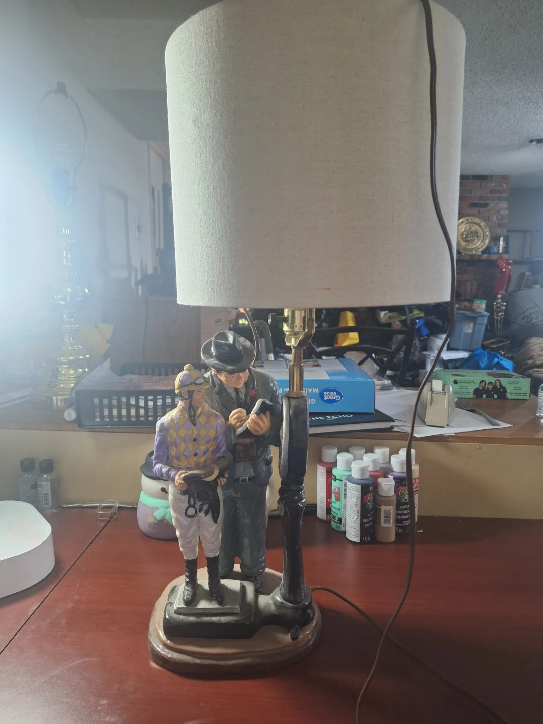 Selling a vintage Florentine Art Studio lamp titled "The Weigh In". This handcrafted lamp features a jockey and another figure. It's a unique piece for any collector or anyone looking to add a touch of vintage charm to their home!