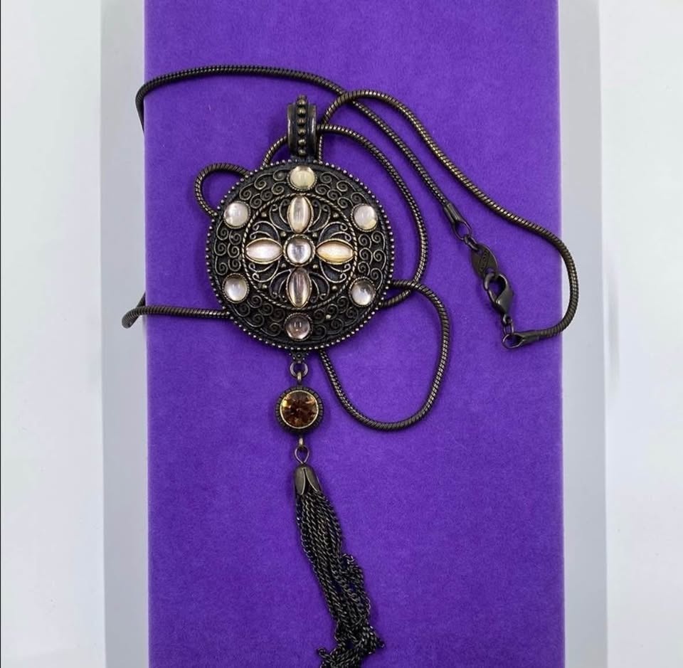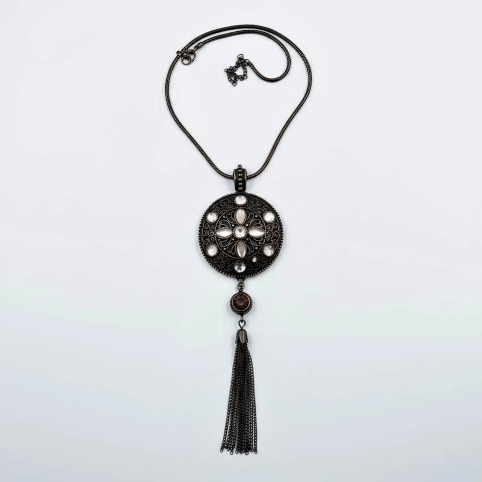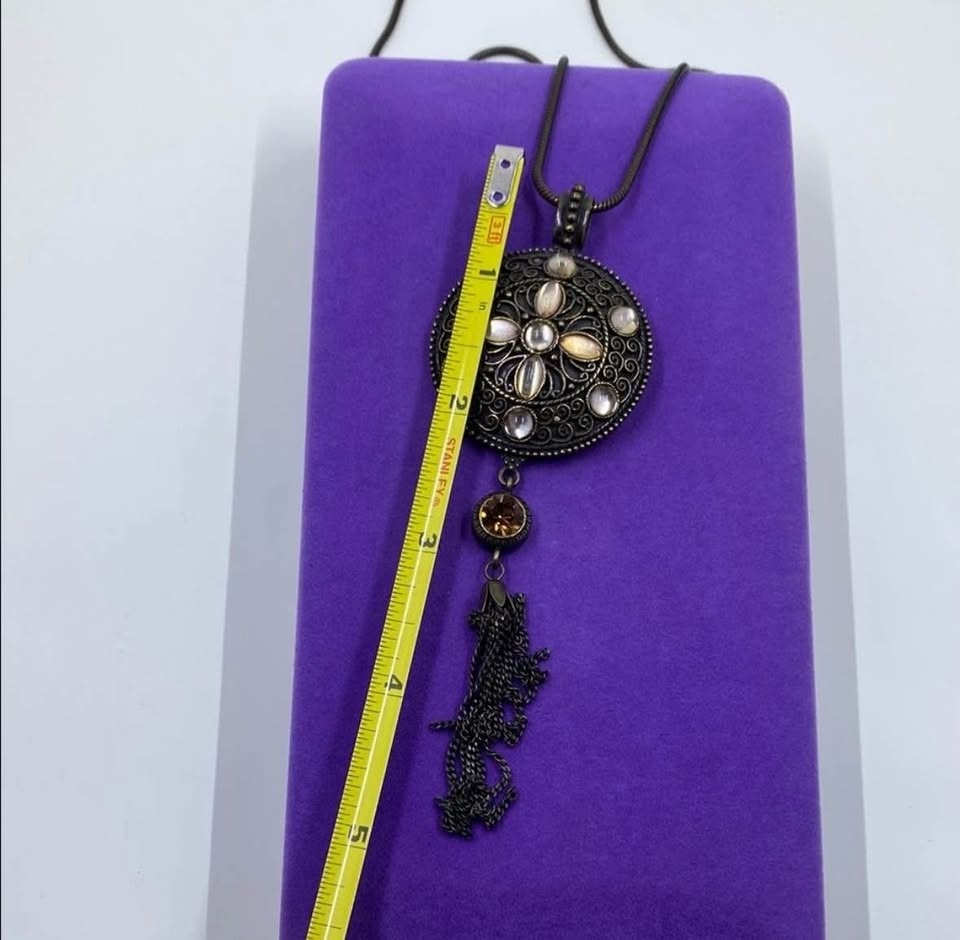 This classic vintage Avon necklace features a striking round pendant with ornate filigree detailing, set with luminous cabochon stones and a dramatic chain tassel drop. The pendant is approximately 3 inches in length. The necklace measures 25 inches and closes securely with a vintage-style clasp. This necklace retains its original “Avon” mark or tag. Condition is vintage/preloved with only minimal surface flaws typical of age, and all stones and findings are intact.