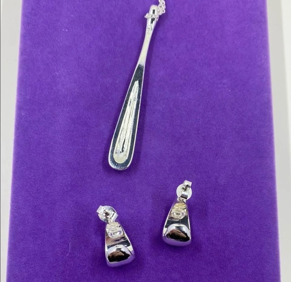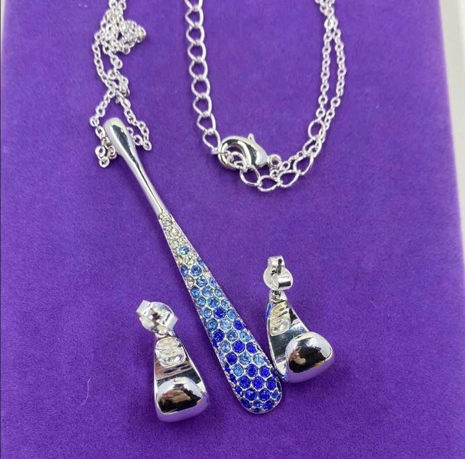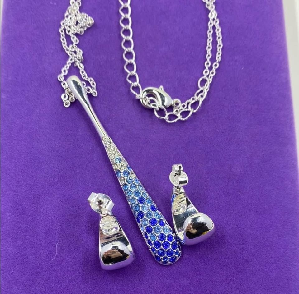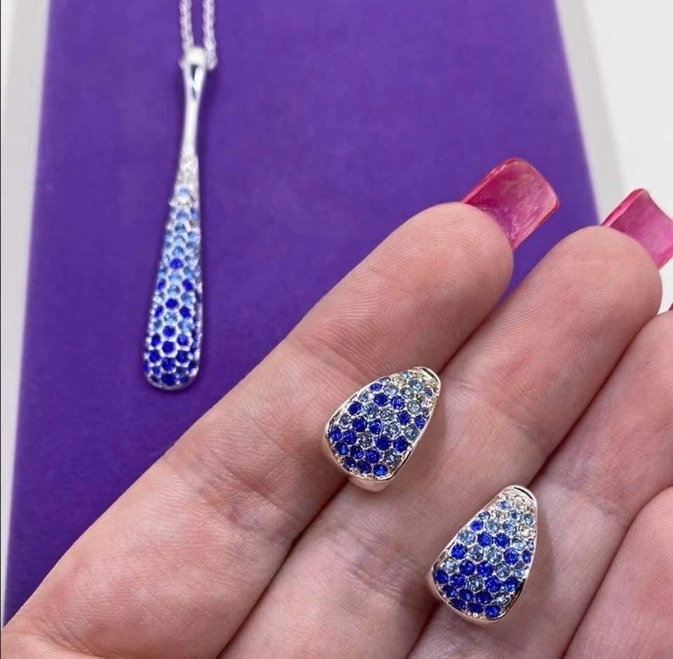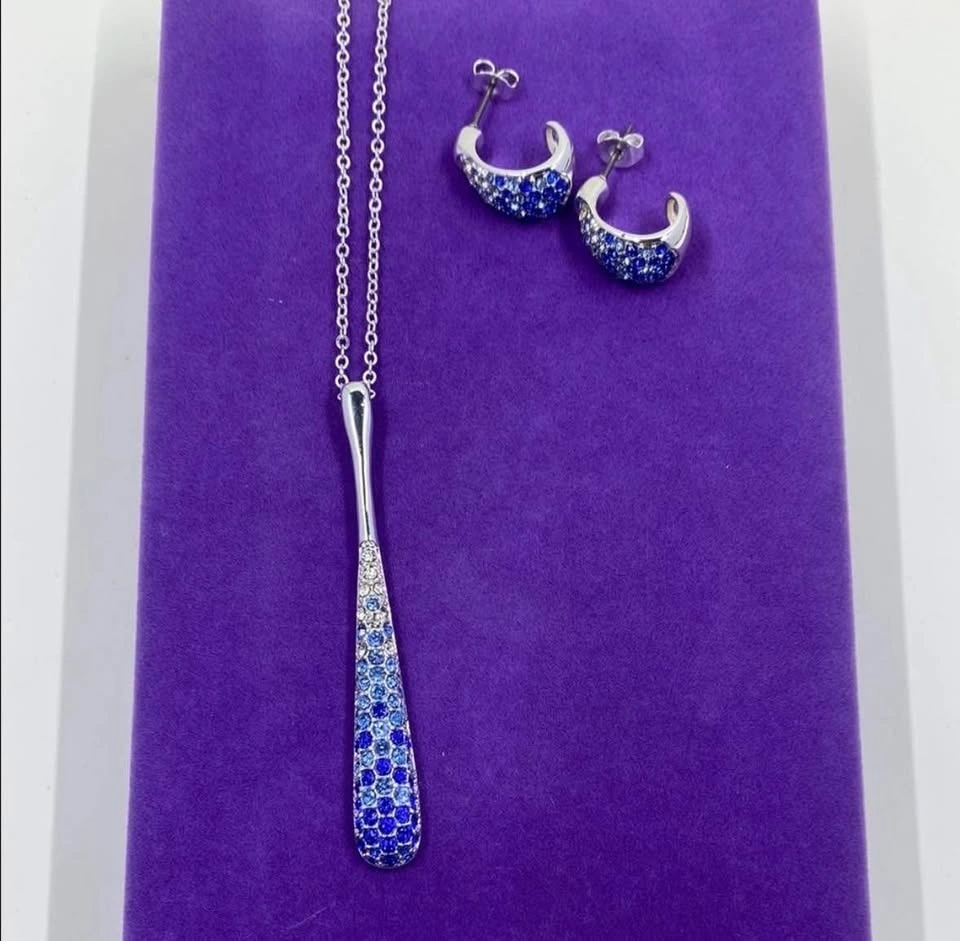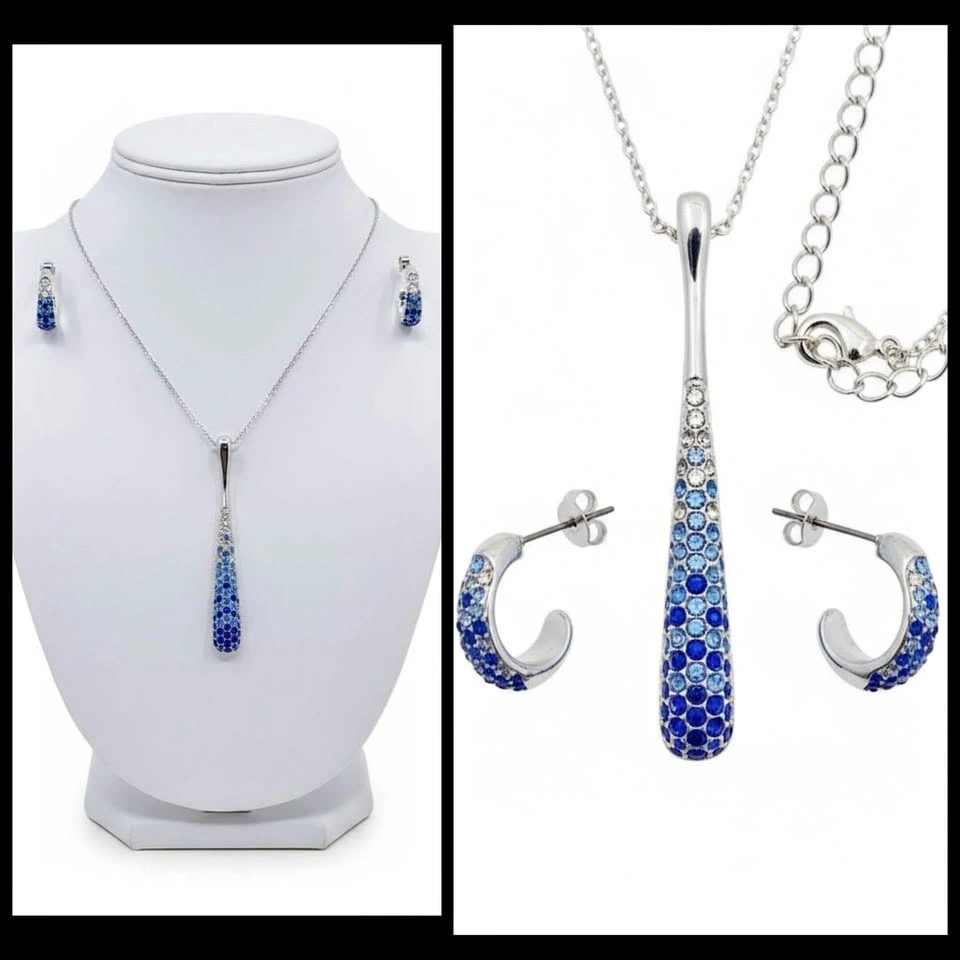Stunning vintage necklace and earring set by Nataliya V Collister (stamped NVC). It showcases a long, modern teardrop pendant and matching crescent rhinestone hoop earrings. Each piece is meticulously hand-set with dazzling blue and clear pave crystals in a gradient effect. The necklace hangs from a shiny silver-tone chain, and the coordinating earrings are lightweight and comfortable. Marked/signature “NVC” for Nataliya V Collister, this set features the designer’s high-quality craftsmanship and artistic sensibility. Condition is preloved with all stones secure and very minor wear consistent with gentle use. Length: 18”-20”. Beautiful set for Christmas/winter.