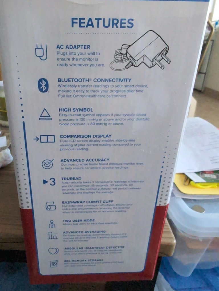 Selling a brand new Omron Blood Pressure Monitor still in its original box! It features Bluetooth connectivity, advanced accuracy, and an easy-wrap comfit cuff. The monitor plugs into the wall with an AC adapter and automatically takes three consecutive readings at intervals to optimize accuracy. It also has a two-user mode and irregular heartbeat detector. Comes with everything in the box!