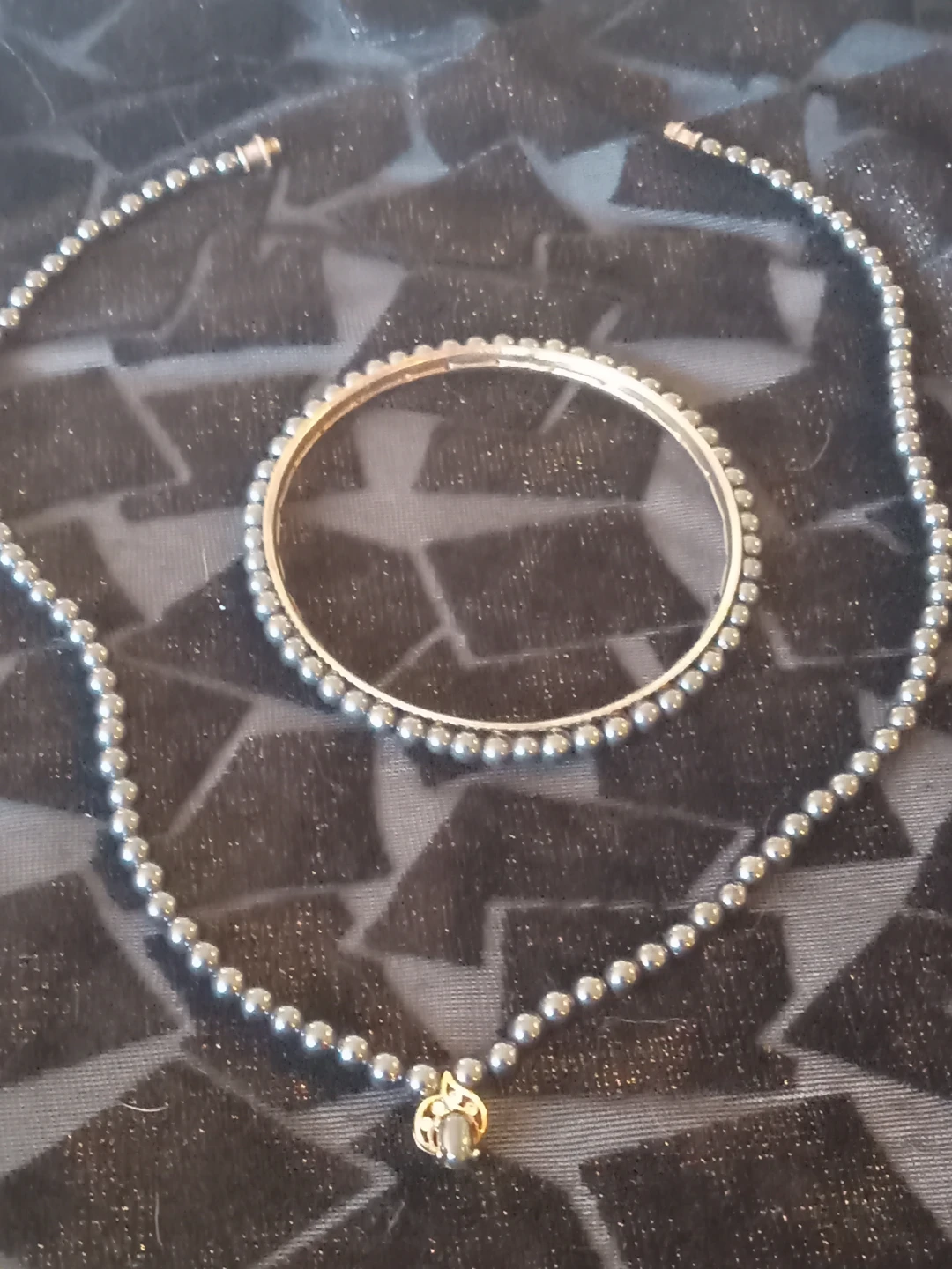 Selling a necklace and bangle set. The necklace features a pendant with a gold-tone design and small stones. The bangle matches with small beads around it.
