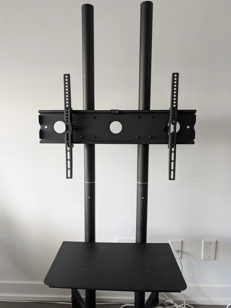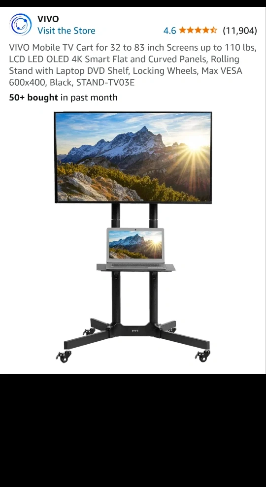 Selling an used mobile TV cart, perfect for screens ranging from 32 to 83 inches. It can support up to 110 lbs and is suitable for LCD, LED, OLED, and 4K Smart Flat and Curved Panels. This rolling stand also includes a laptop DVD shelf and locking wheels for added convenience. It supports Max VESA 600x400 and comes in black. The model number is STAND-TV03E