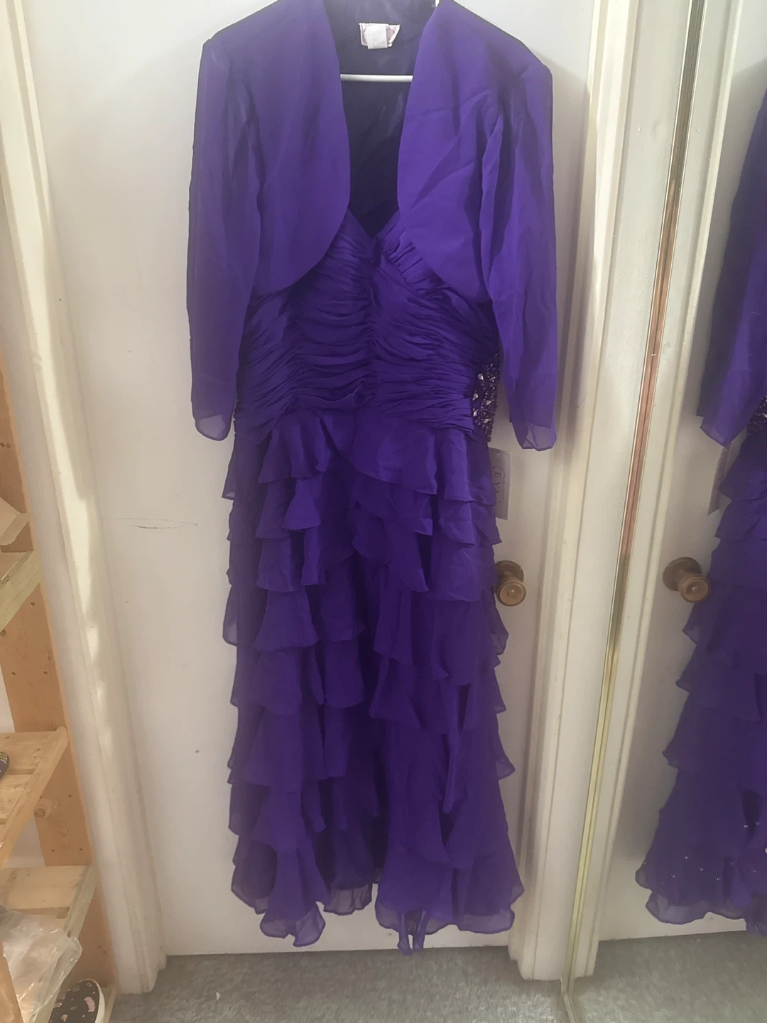 Beautiful purple formal dress with ruffled detailing. It comes with a matching bolero jacket. Perfect for a special occasion!
