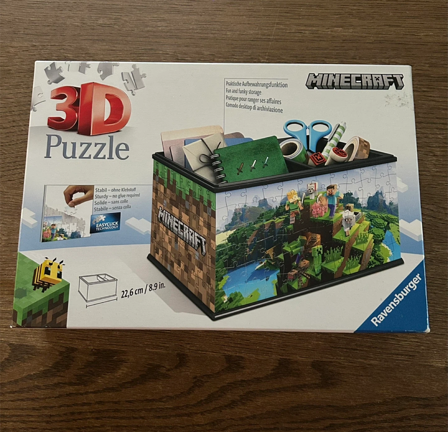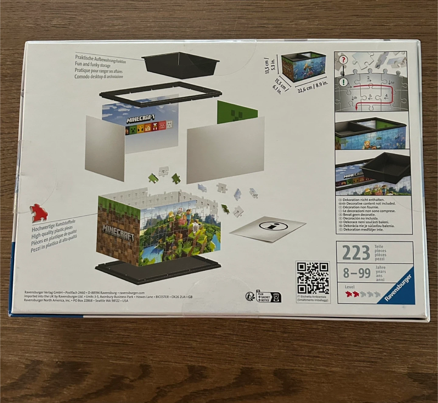 Unopened. Brand New in box. Selling a Minecraft 3D Puzzle Storage Box by Ravensburger! This fun and functional item is perfect for organizing your desk or storing small items. The box is made of high-quality plastic pieces and is easy to assemble without glue. It includes 223 pieces and is recommended for ages 8-99. The assembled box measures 22.6 cm / 8.9 inches