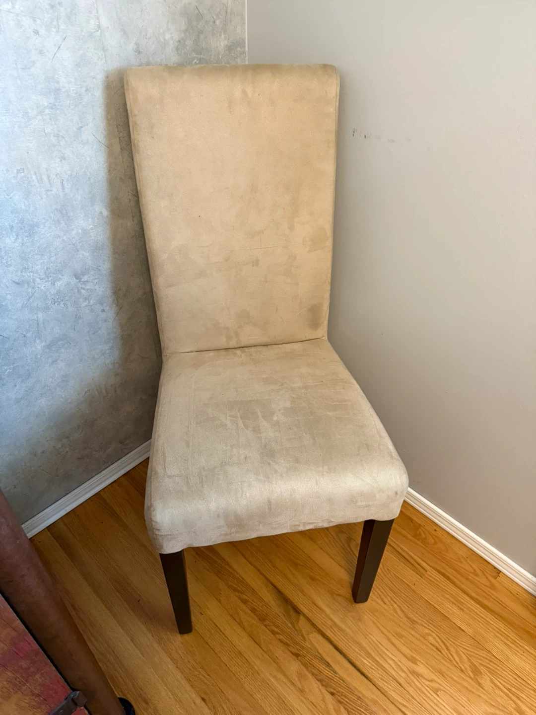 Selling a beige upholstered dining chair. It's in good condition and ready to be part of your dining set. The chair has a neutral colour that will match most dining tables. Perfect for adding extra seating or replacing an old chair!